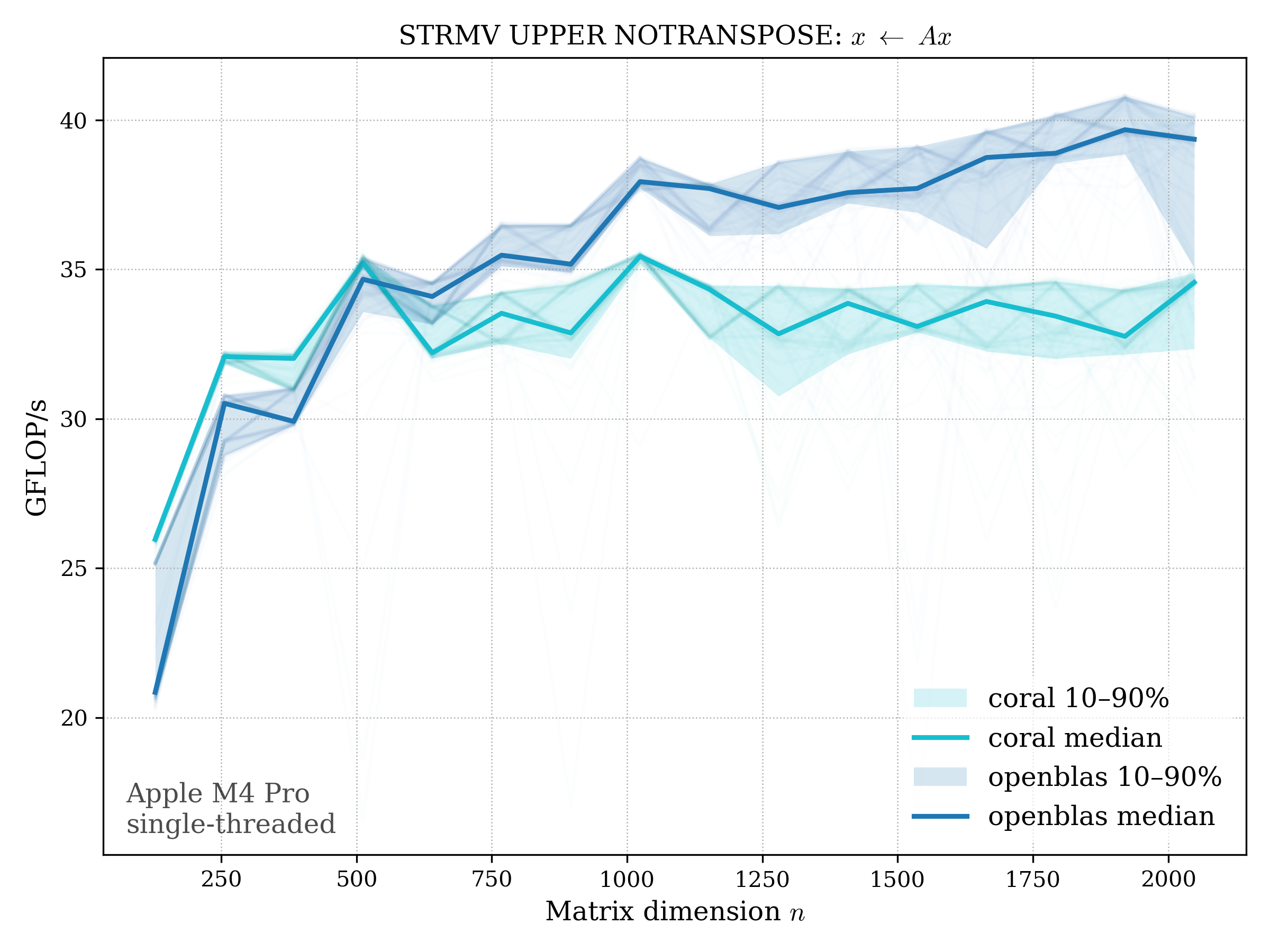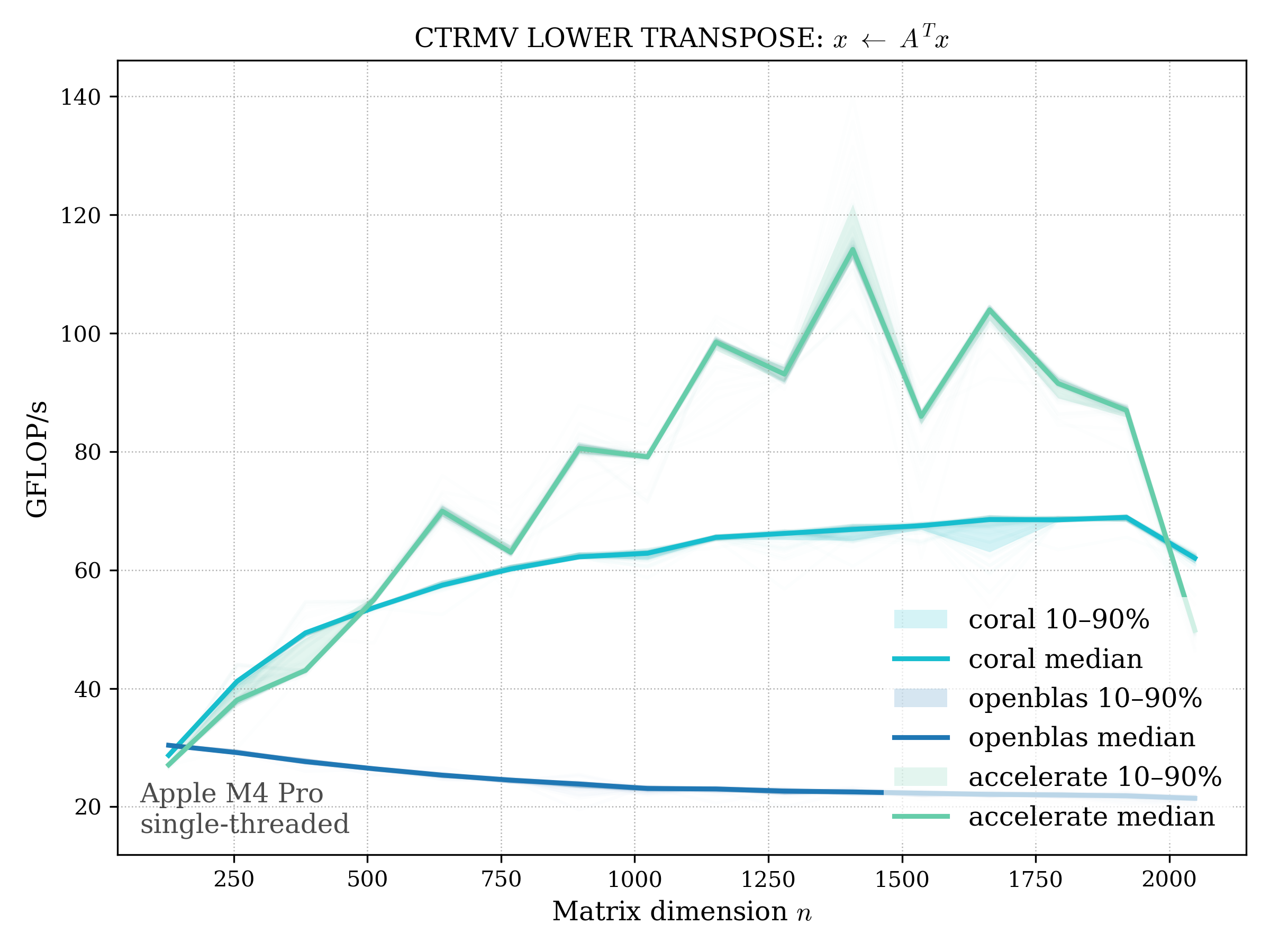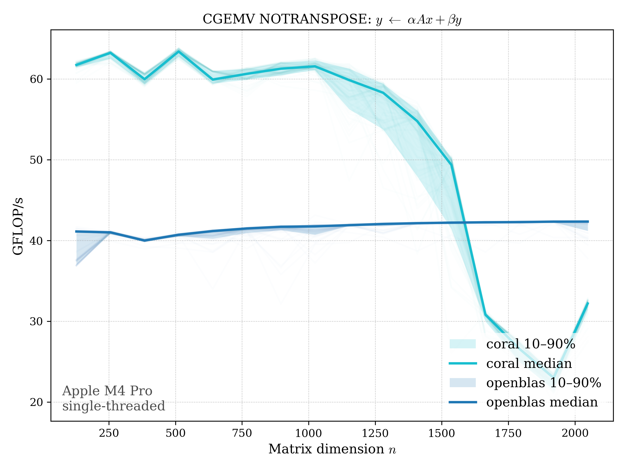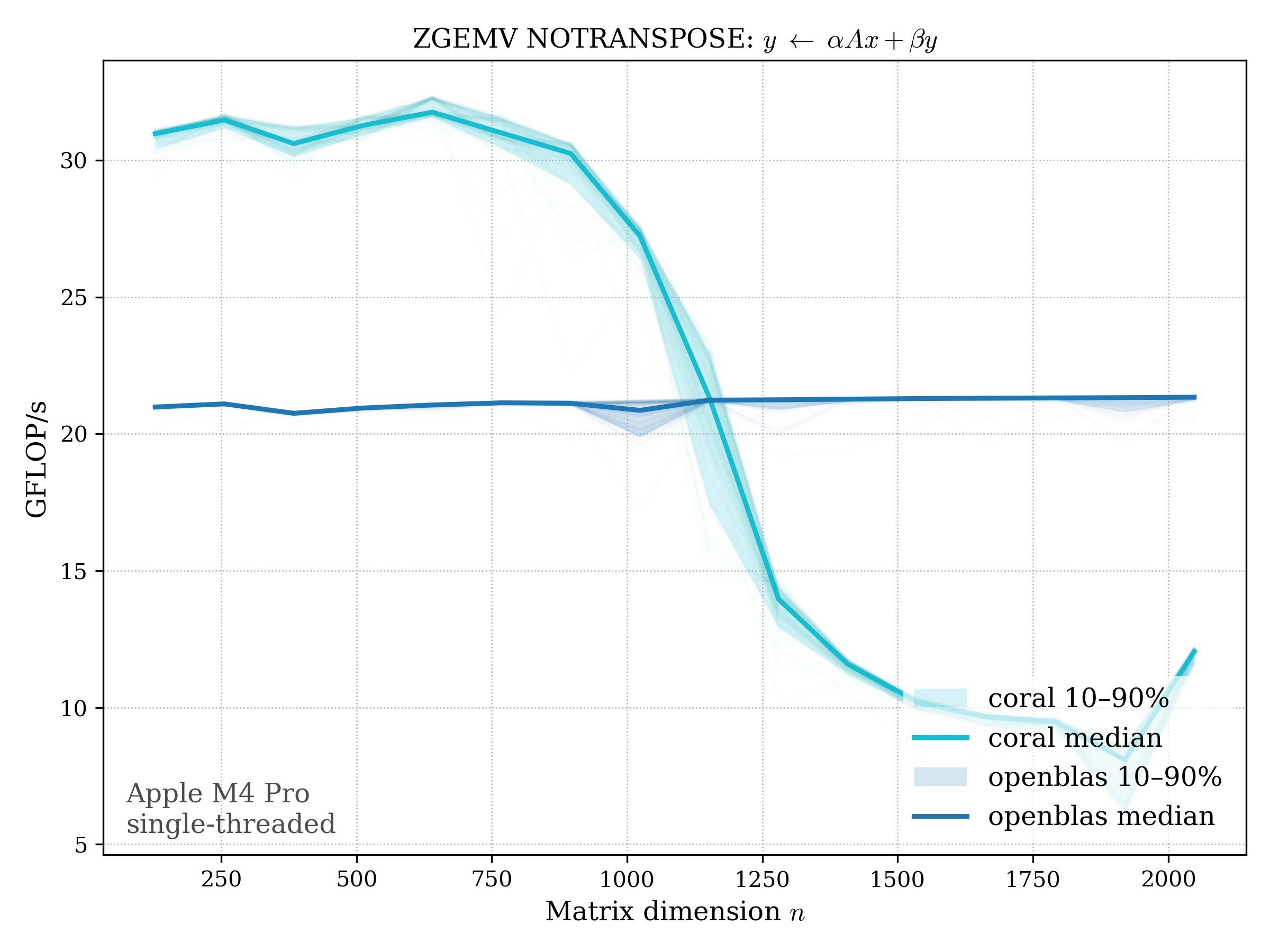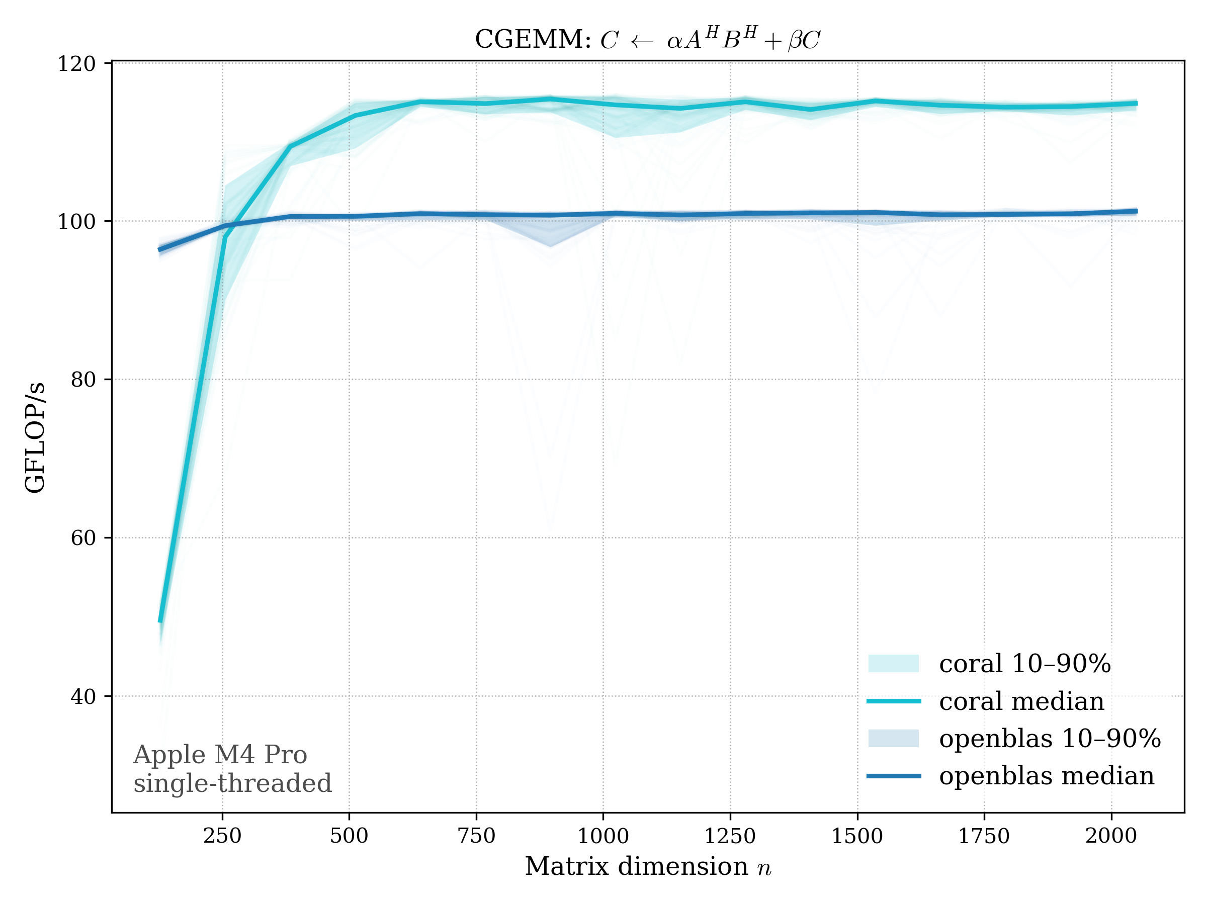 In all plots, CORAL is benchmarked against OpenBLAS. Some routines also include Apple Accelerate. When Accelerate is omitted, it’s because its AMX-backed kernels on this M4 MacBook Pro are much faster and mask any comparison with OpenBLAS.
