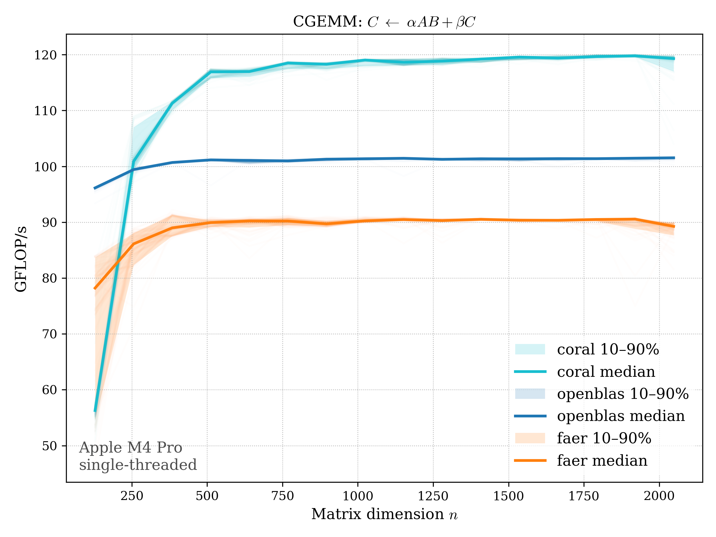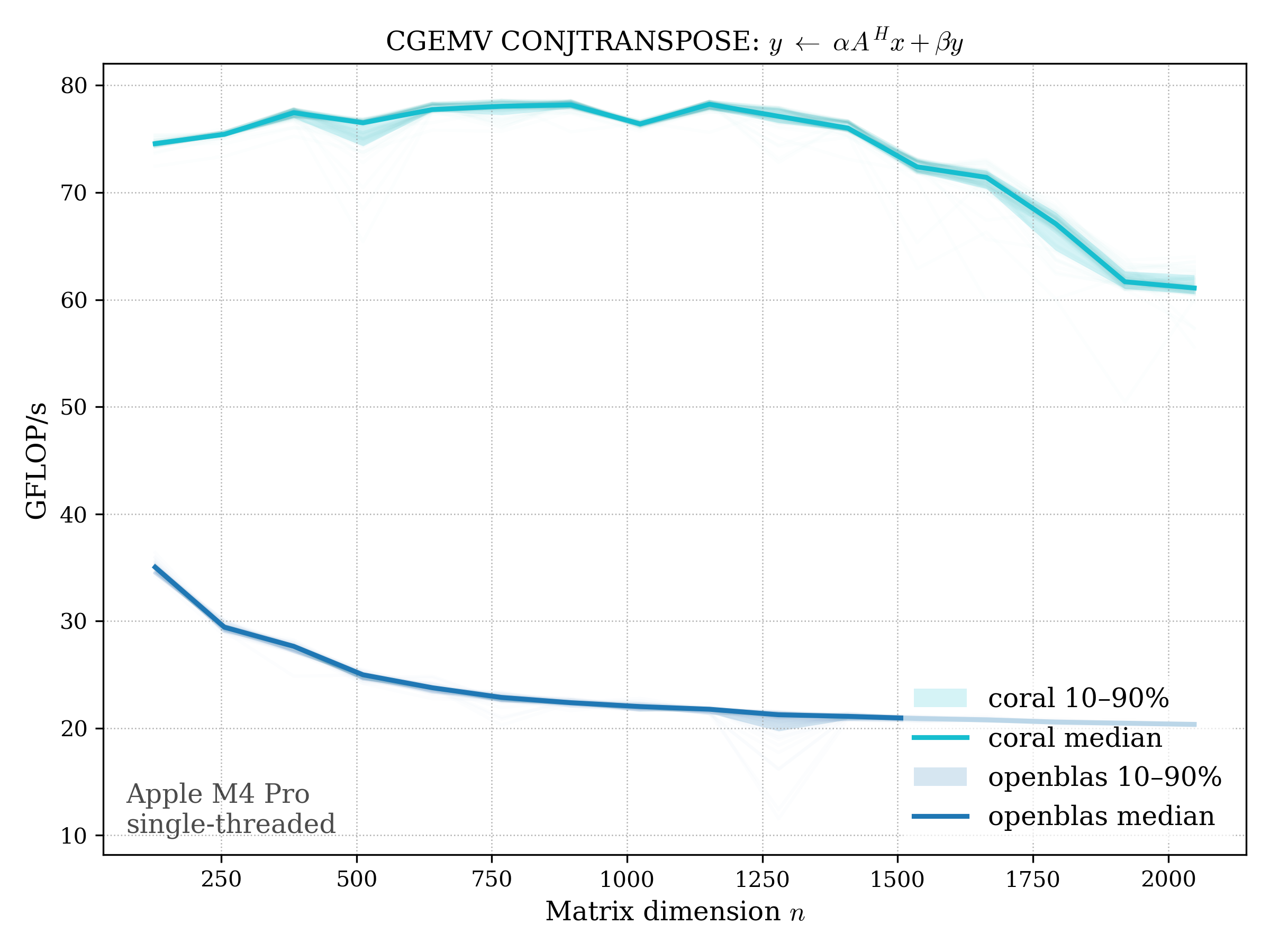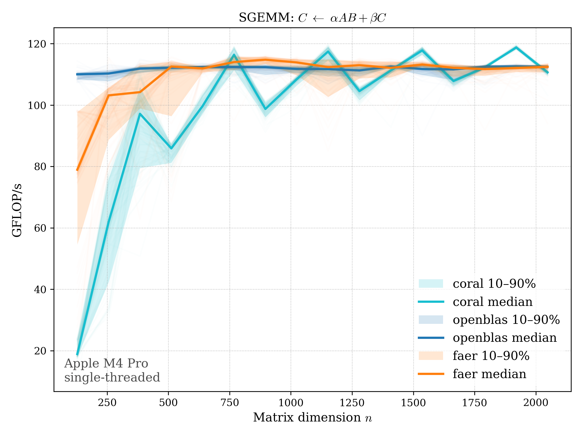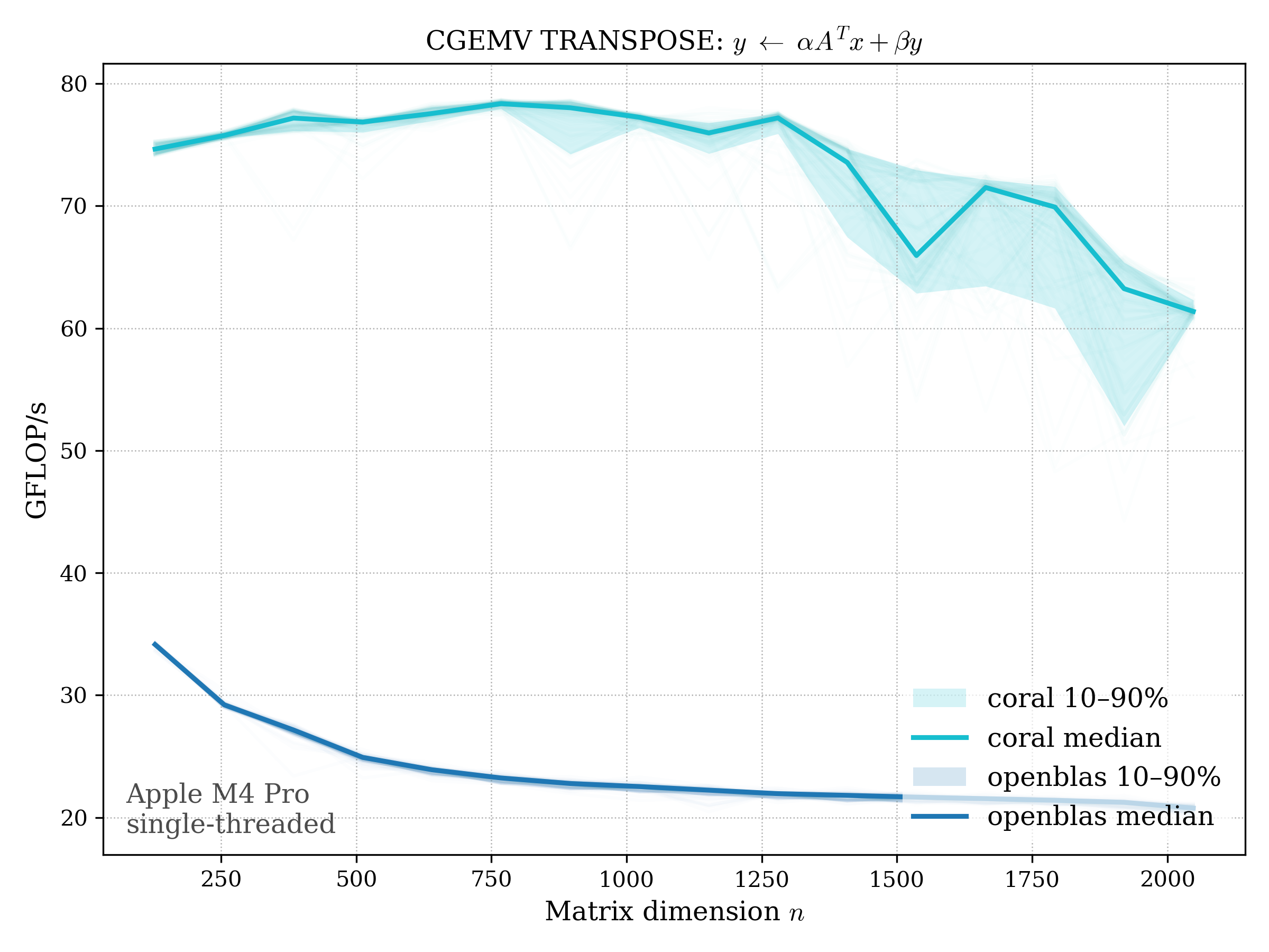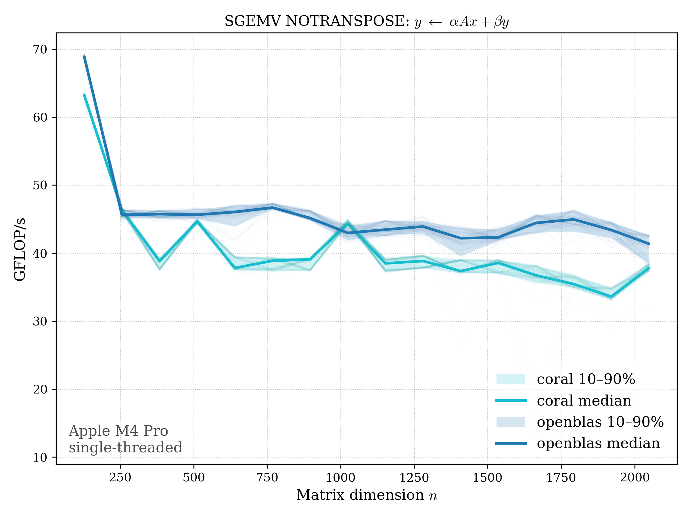 In all plots, CORAL is benchmarked against OpenBLAS. Some routines also include Apple Accelerate. When Accelerate is omitted, it’s because its AMX-backed kernels on this M4 MacBook Pro are much faster and mask any comparison with OpenBLAS.