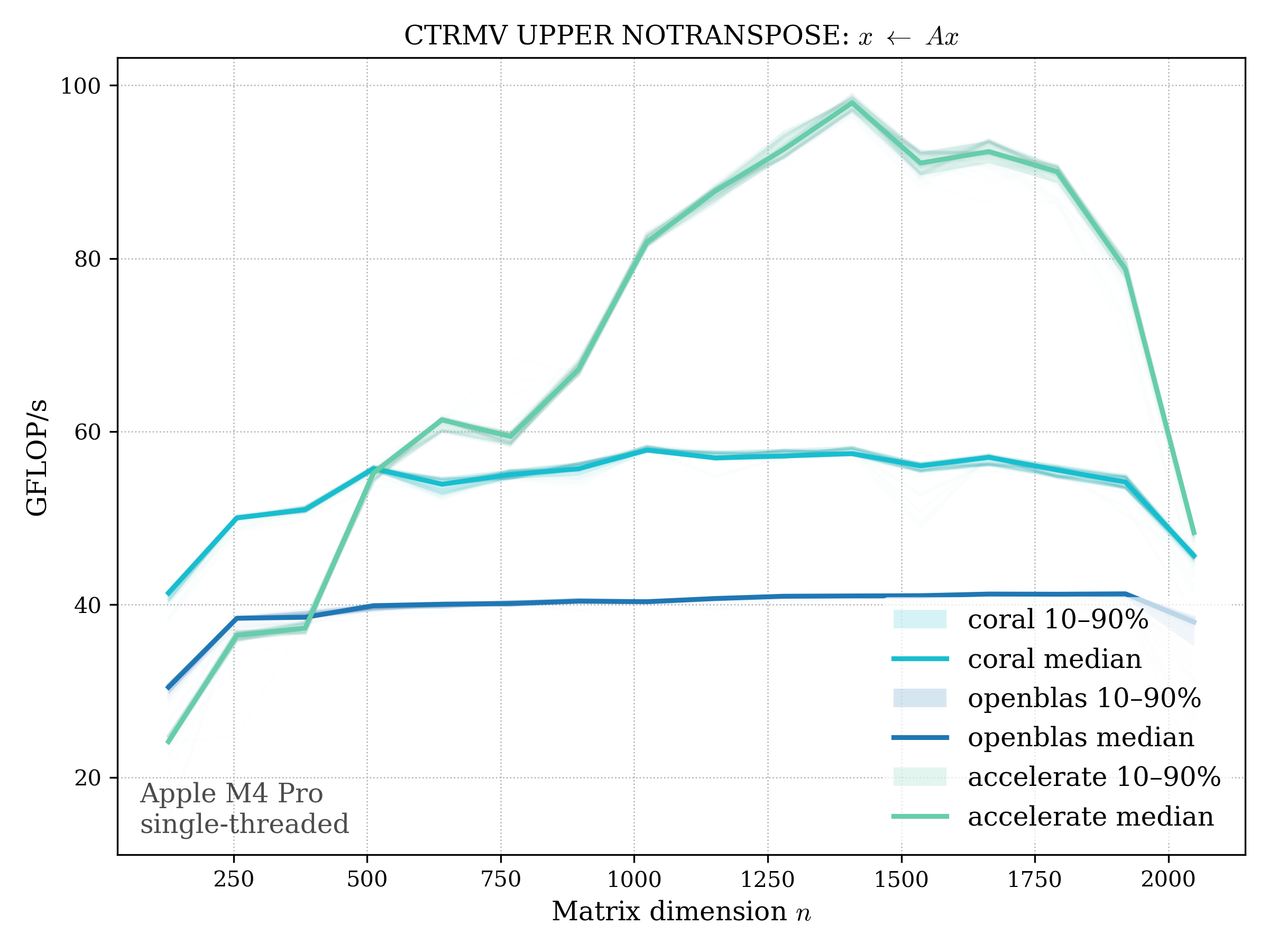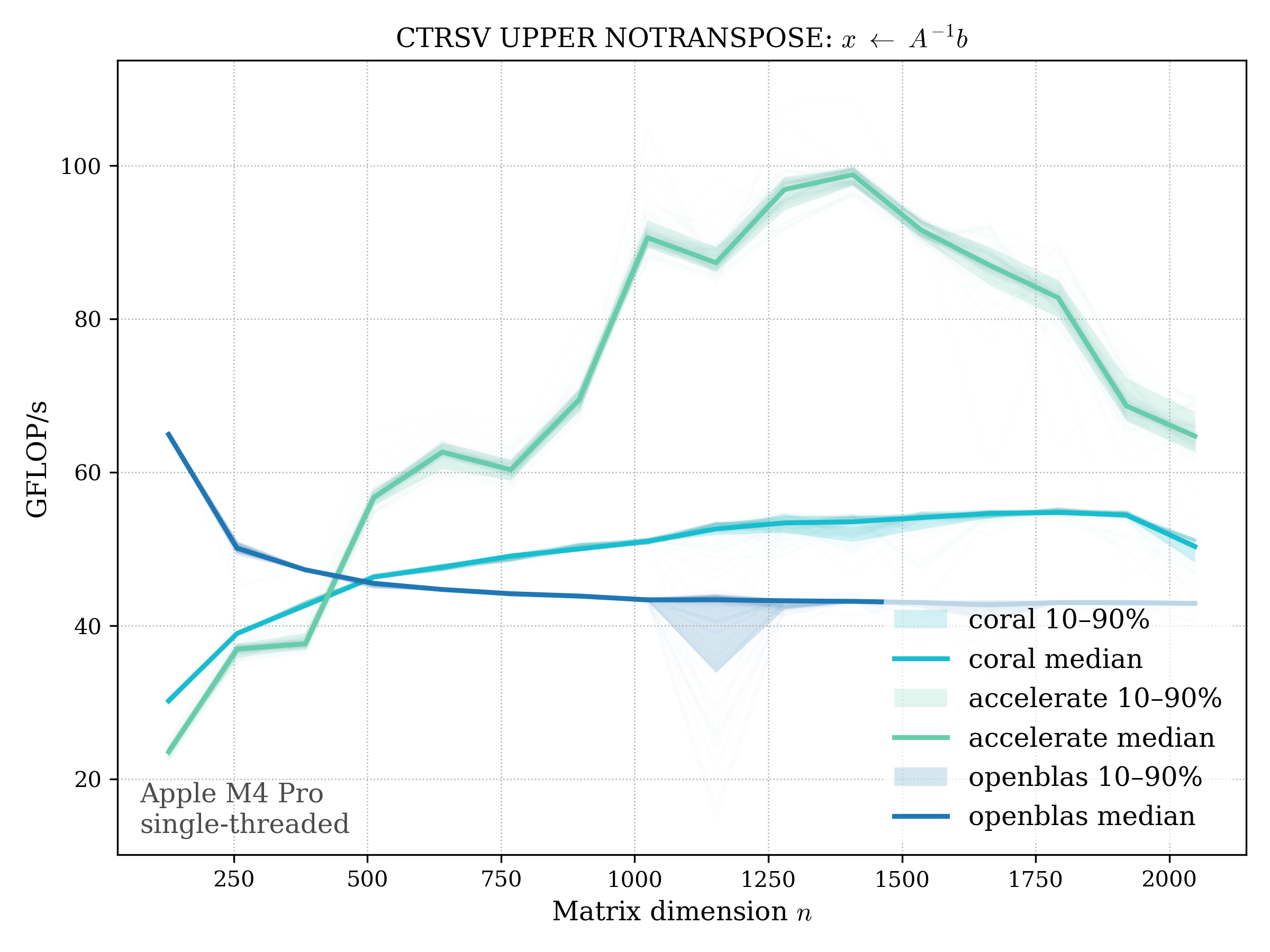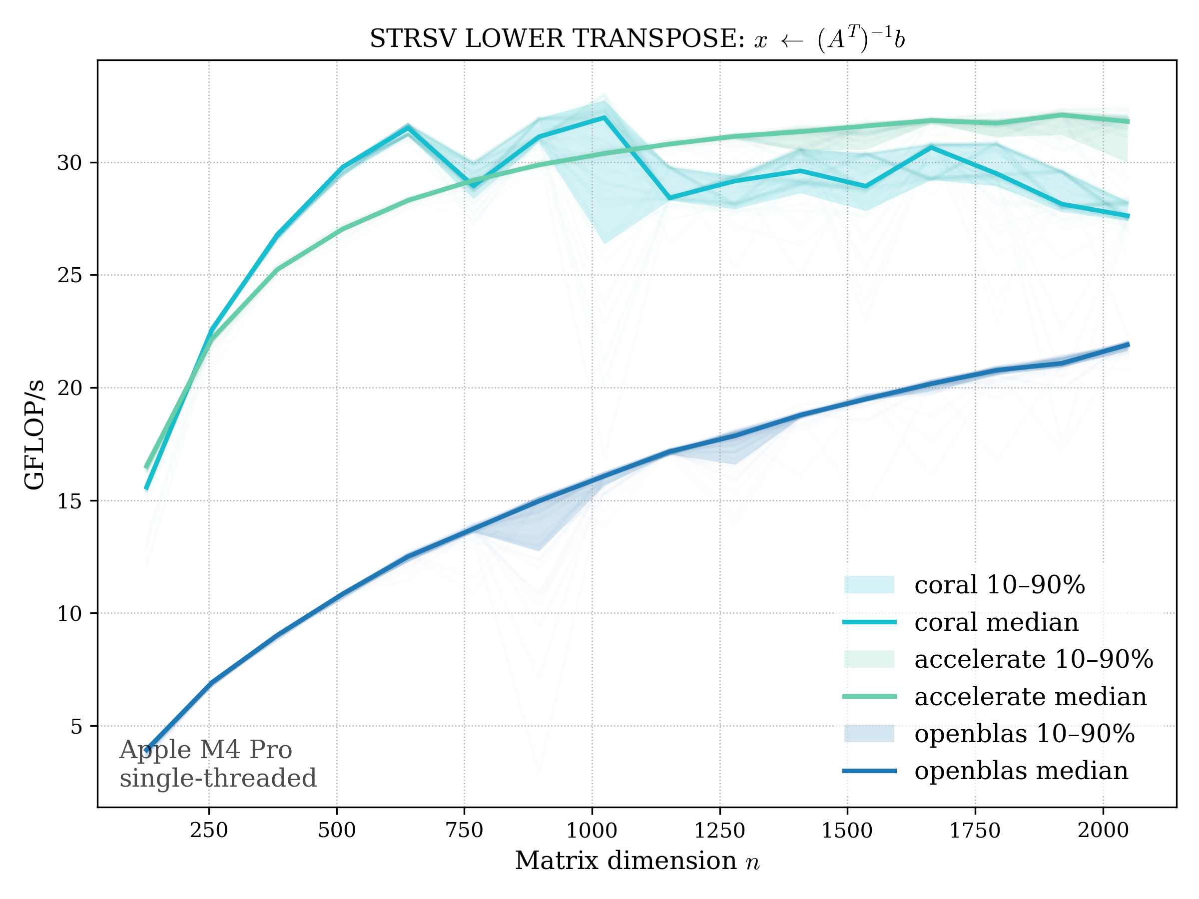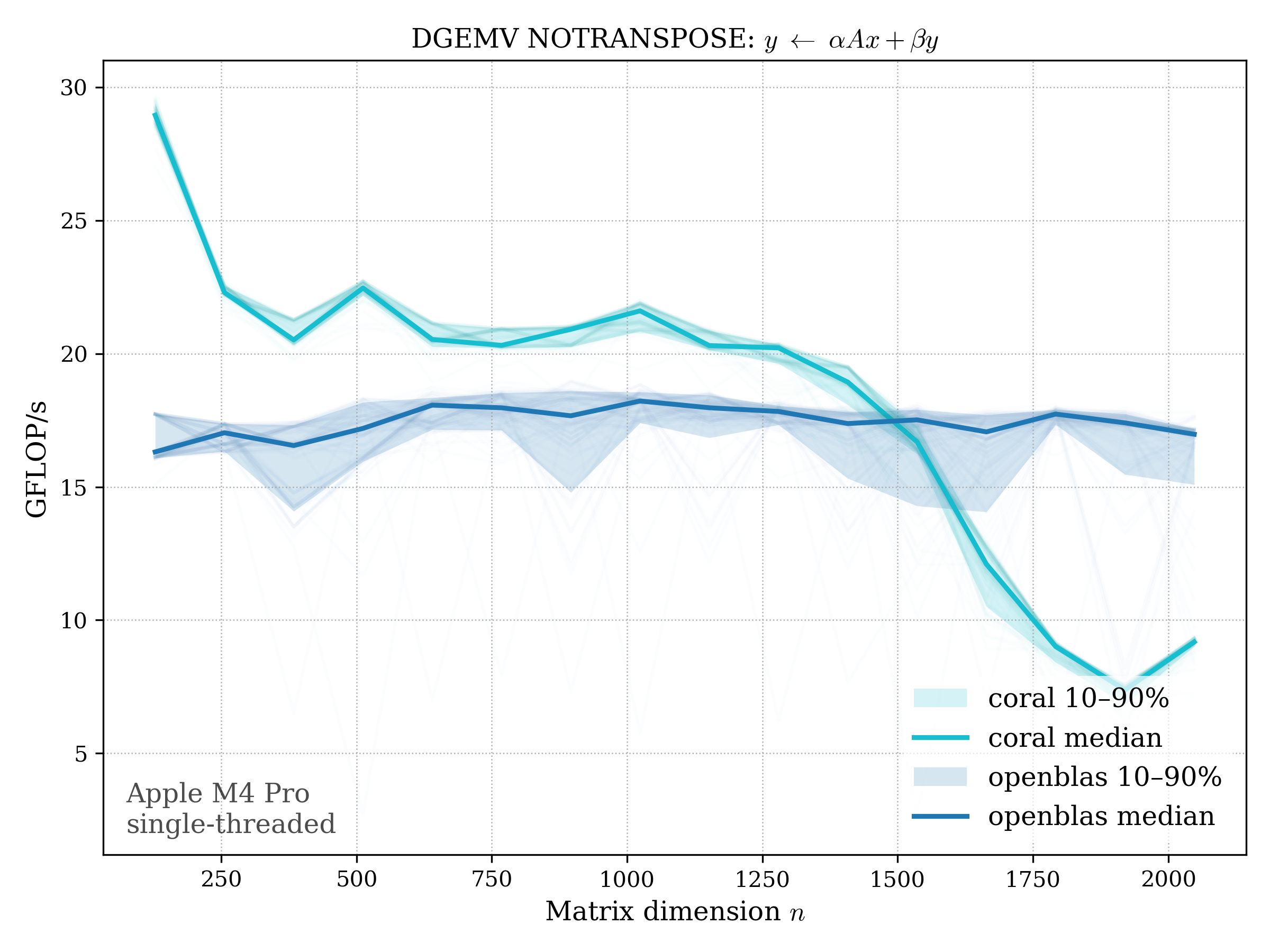 In all plots, CORAL is benchmarked against OpenBLAS. Some routines also include Apple Accelerate. When Accelerate is omitted, it’s because its AMX-backed kernels on this M4 MacBook Pro are much faster and mask any comparison with OpenBLAS.