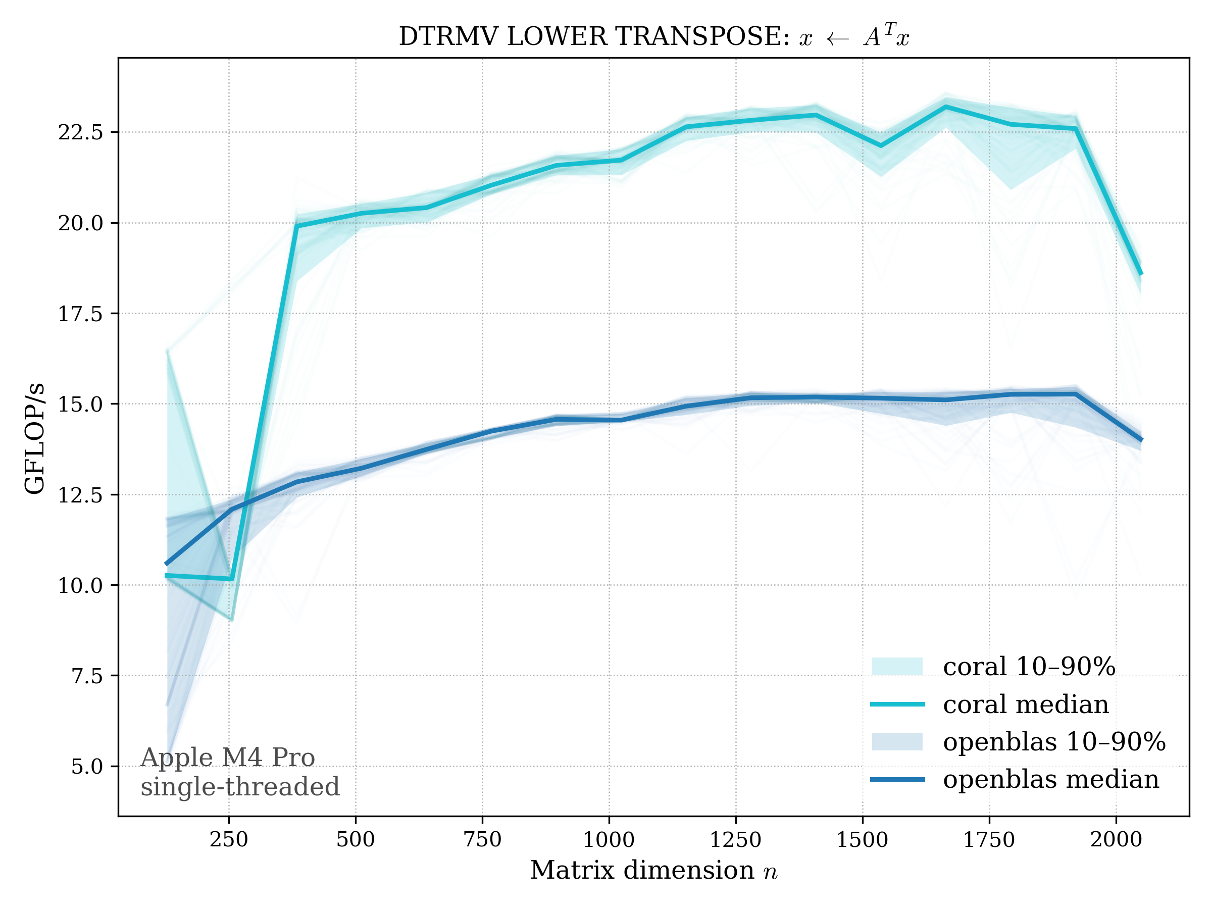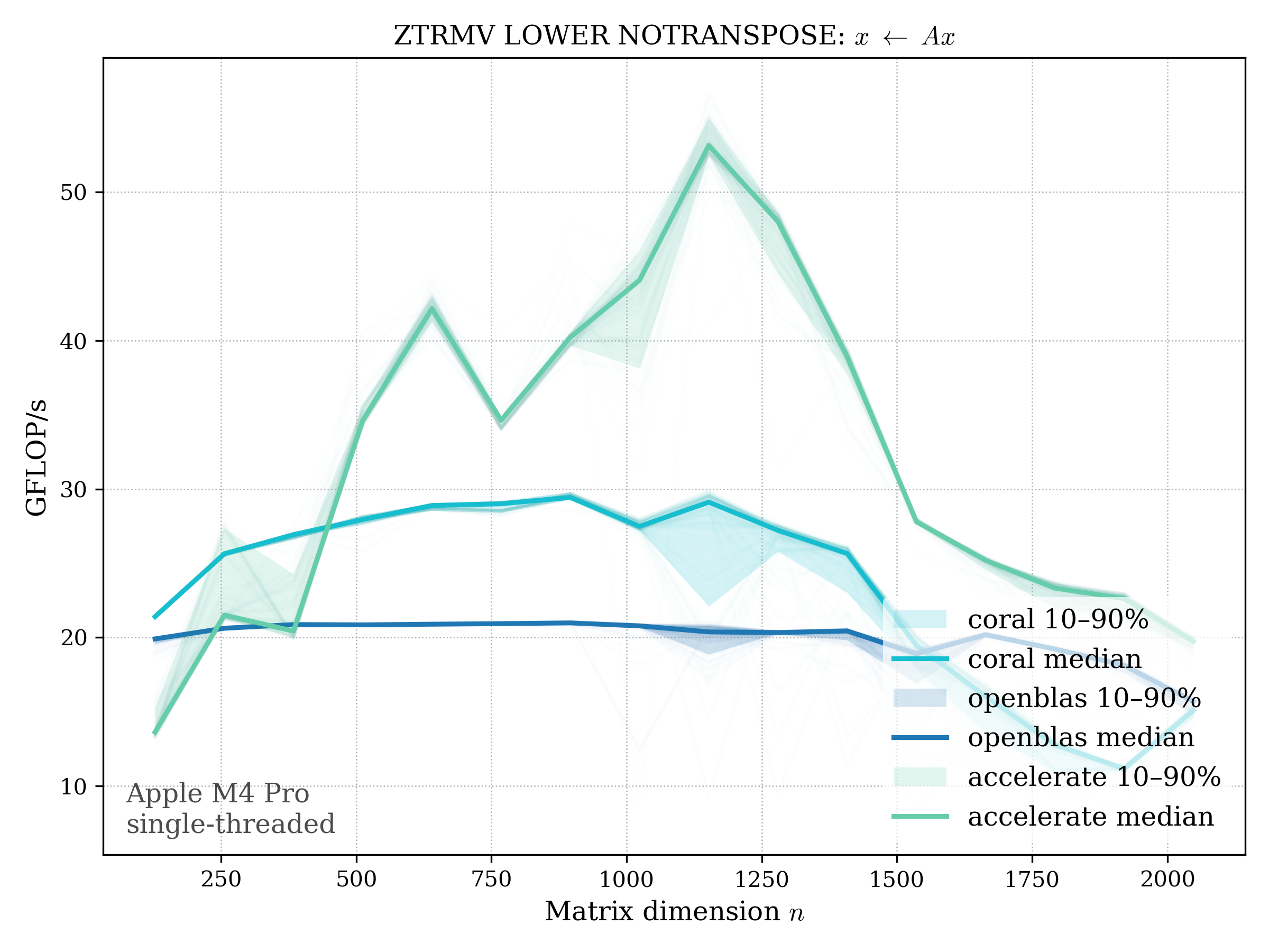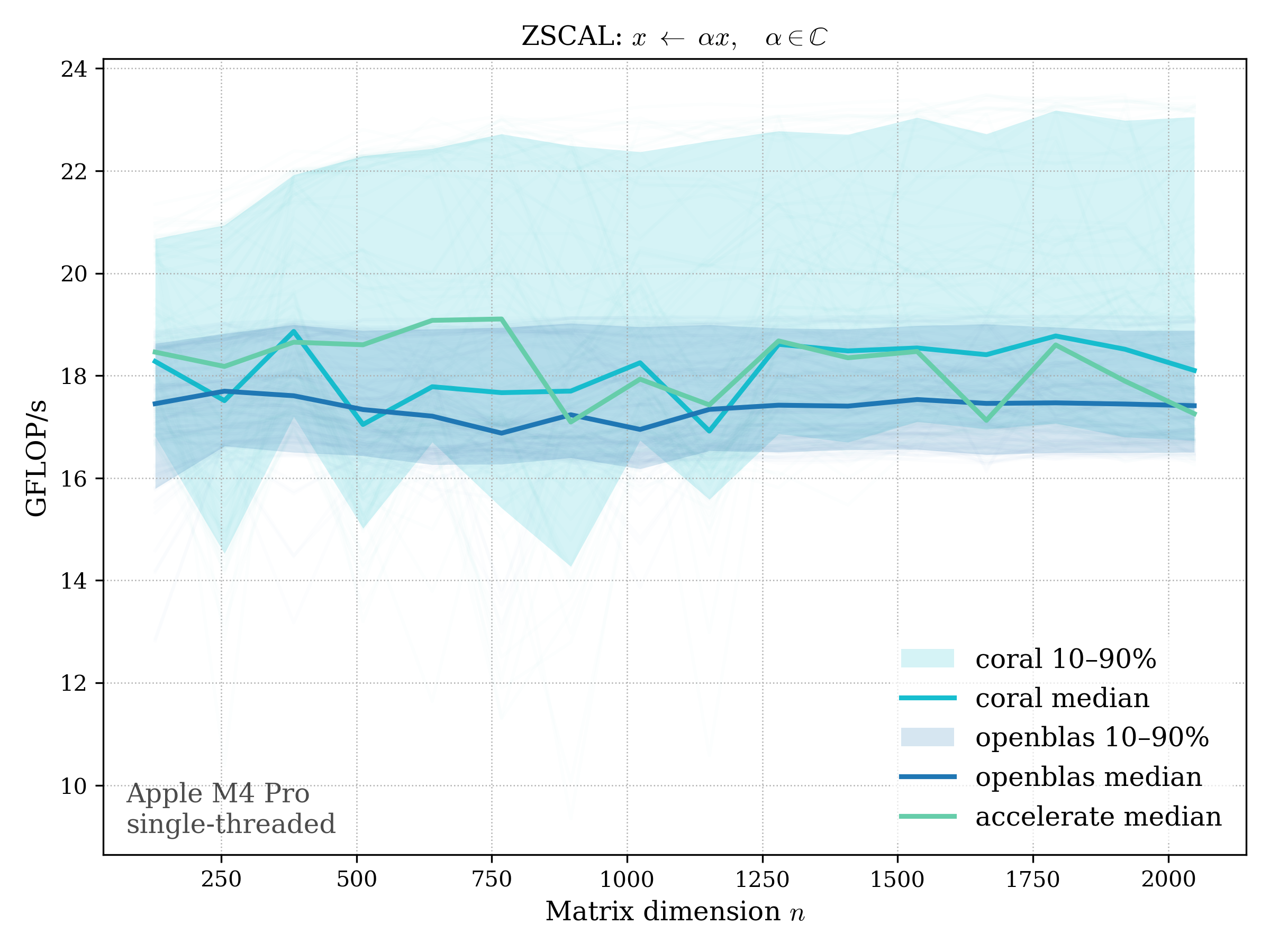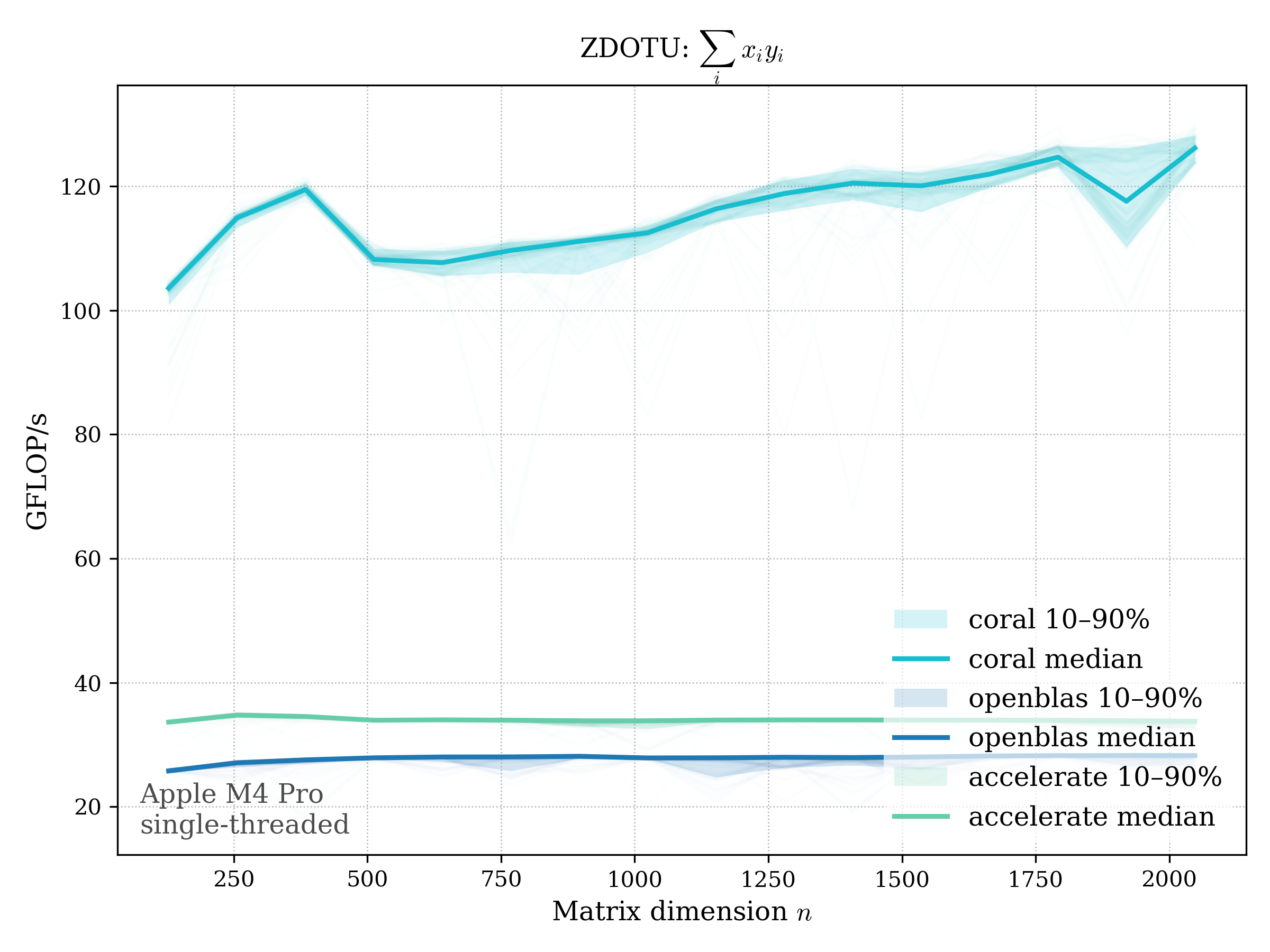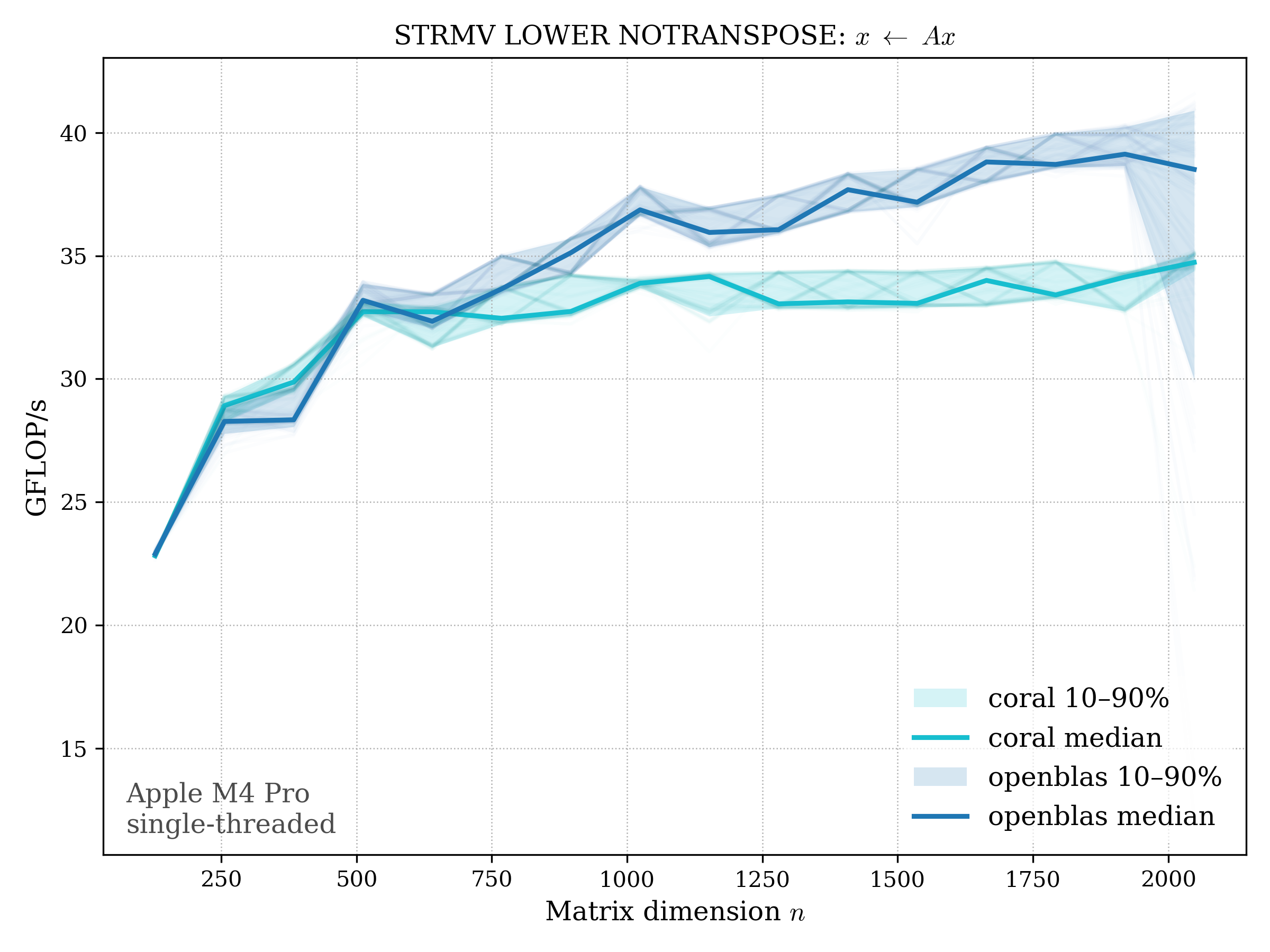 In all plots, CORAL is benchmarked against OpenBLAS. Some routines also include Apple Accelerate. When Accelerate is omitted, it’s because its AMX-backed kernels on this M4 MacBook Pro are much faster and mask any comparison with OpenBLAS.