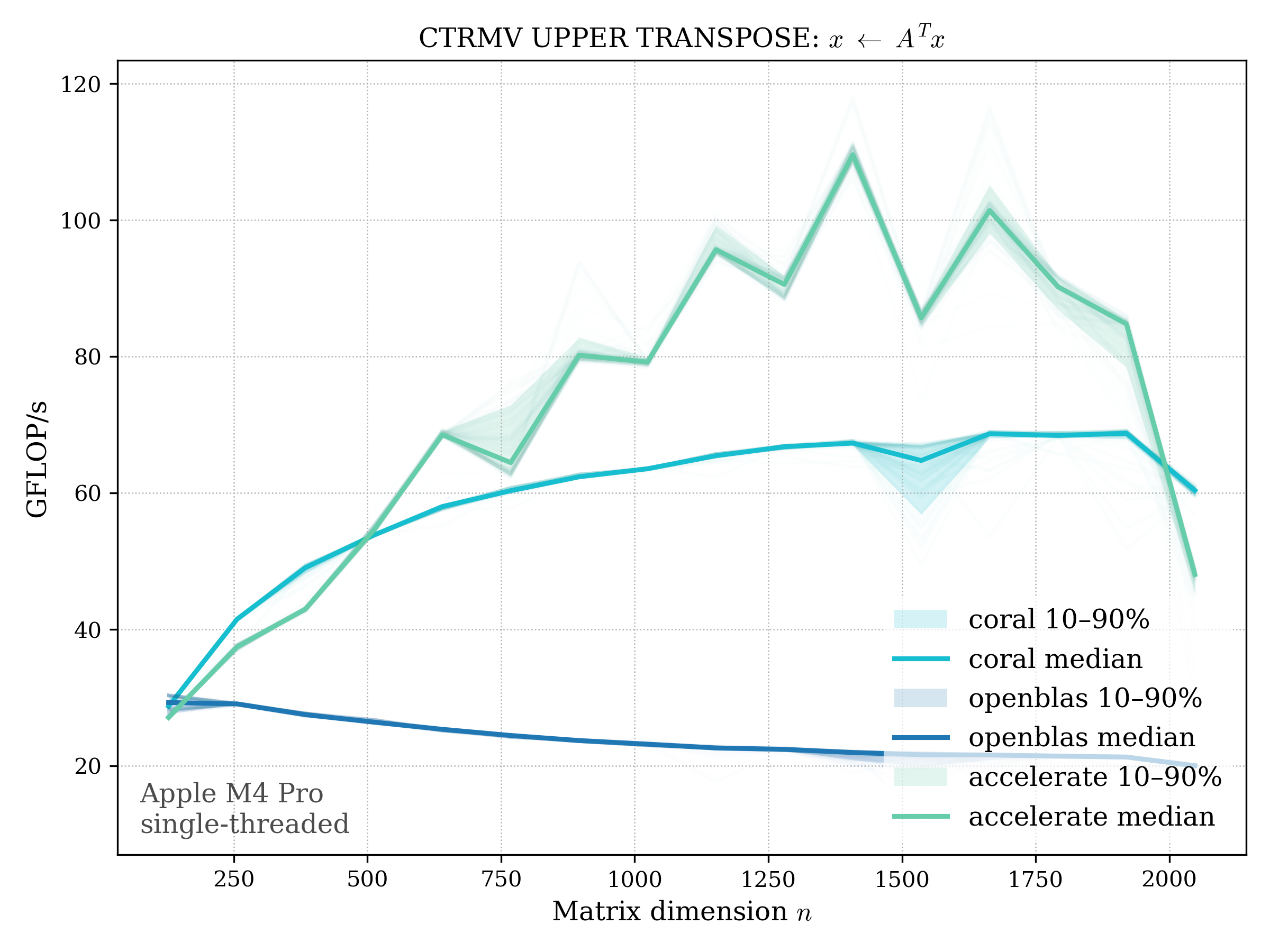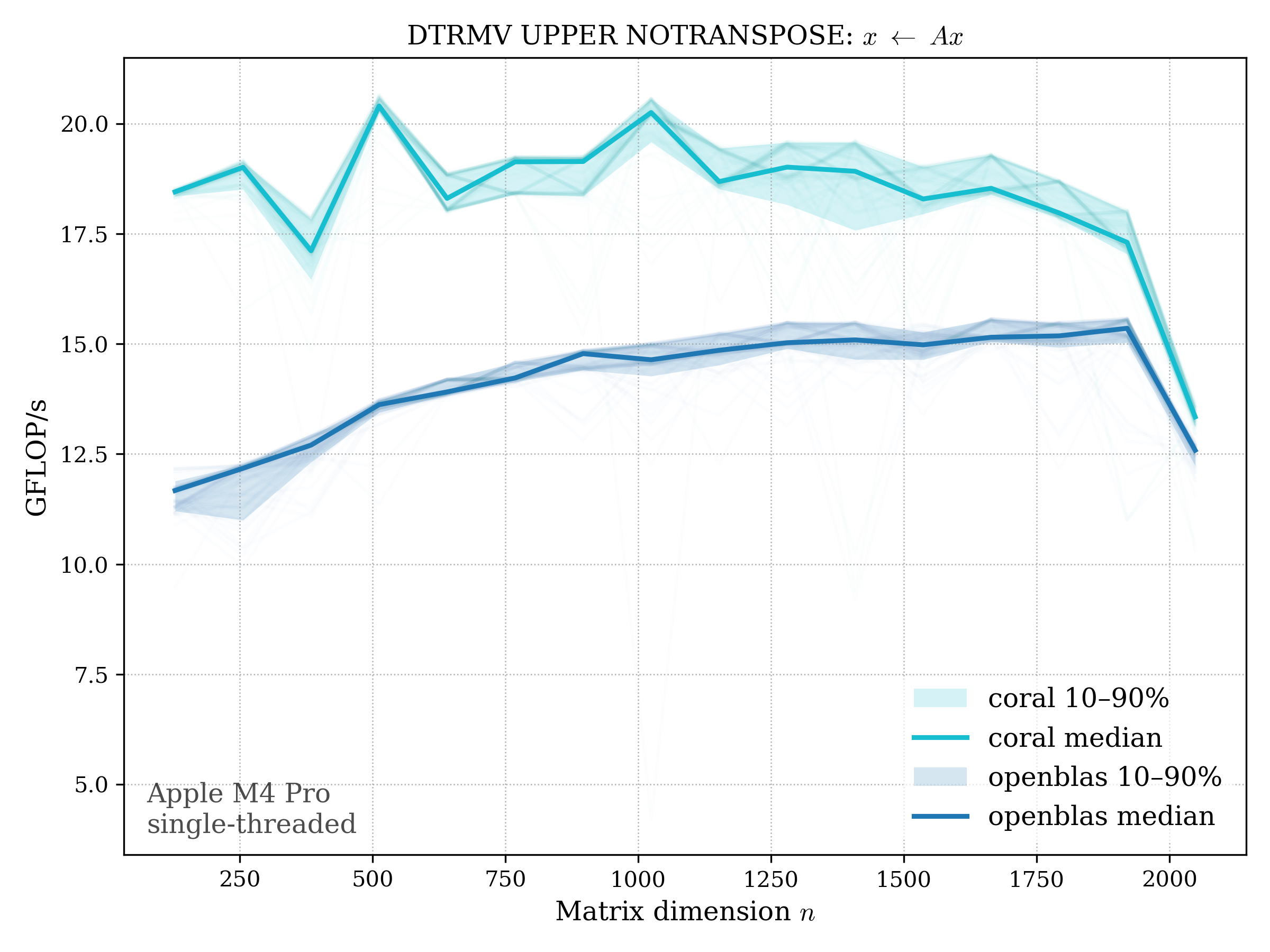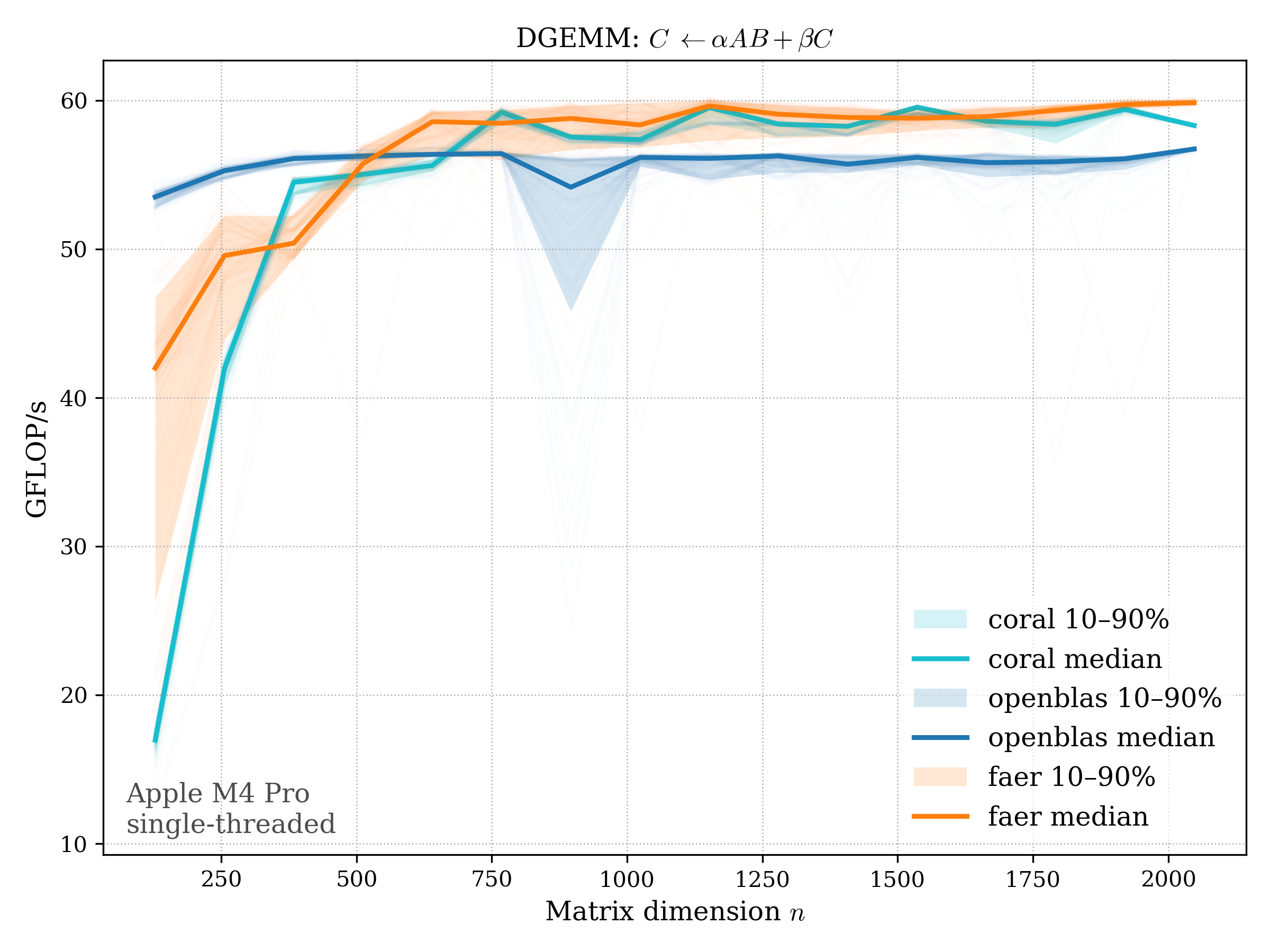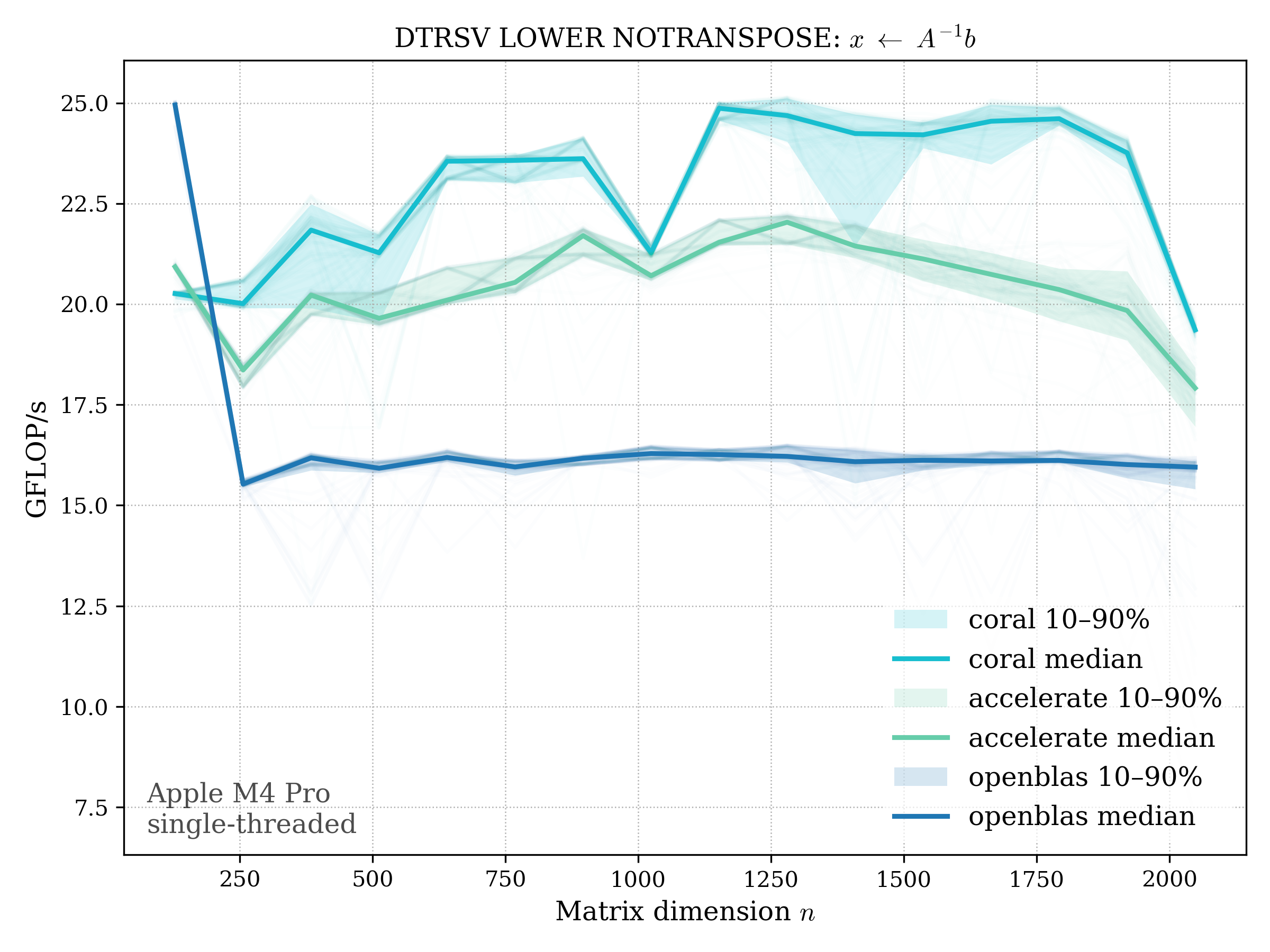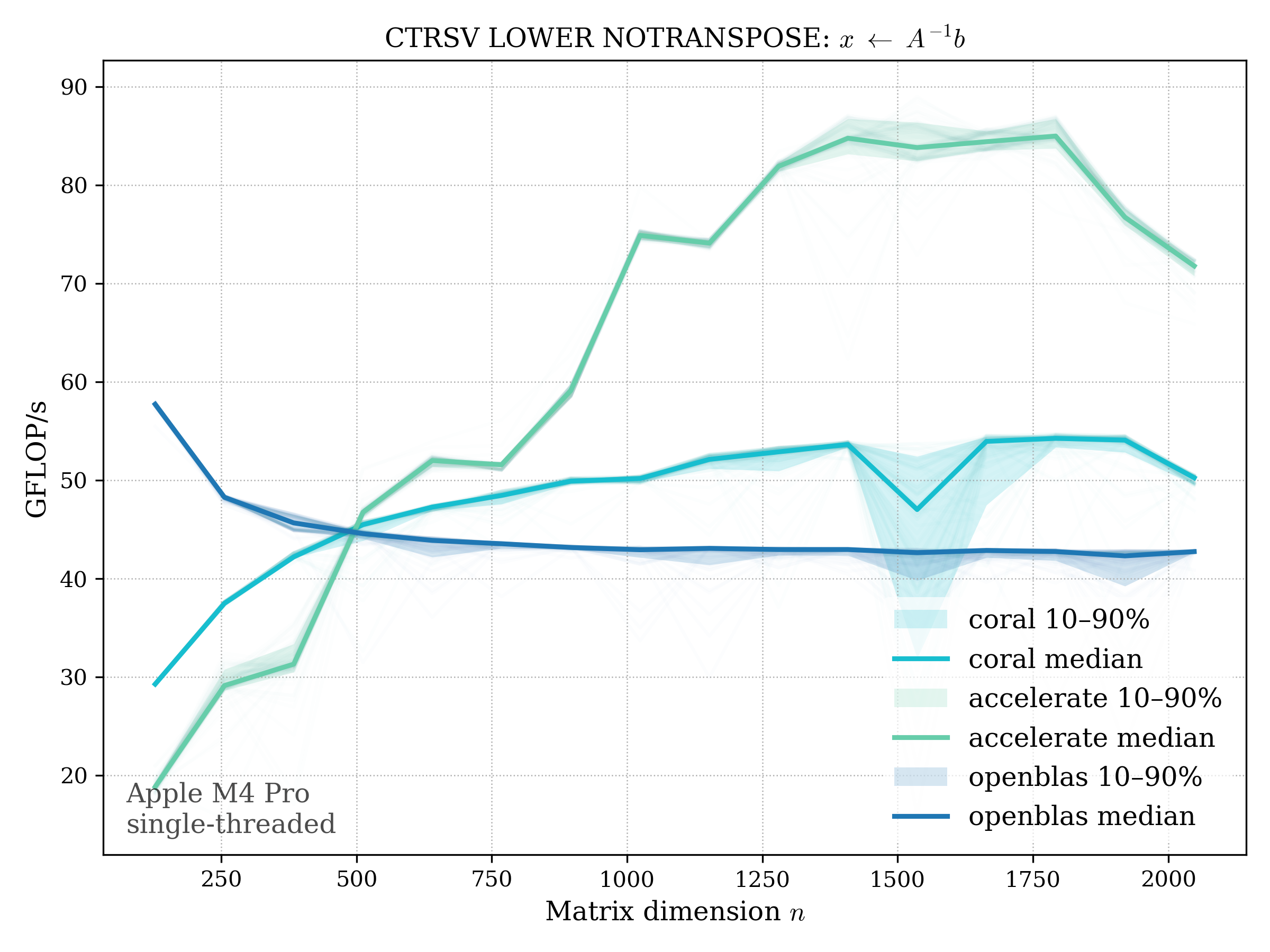 In all plots, CORAL is benchmarked against OpenBLAS. Some routines also include Apple Accelerate. When Accelerate is omitted, it’s because its AMX-backed kernels on this M4 MacBook Pro are much faster and mask any comparison with OpenBLAS.