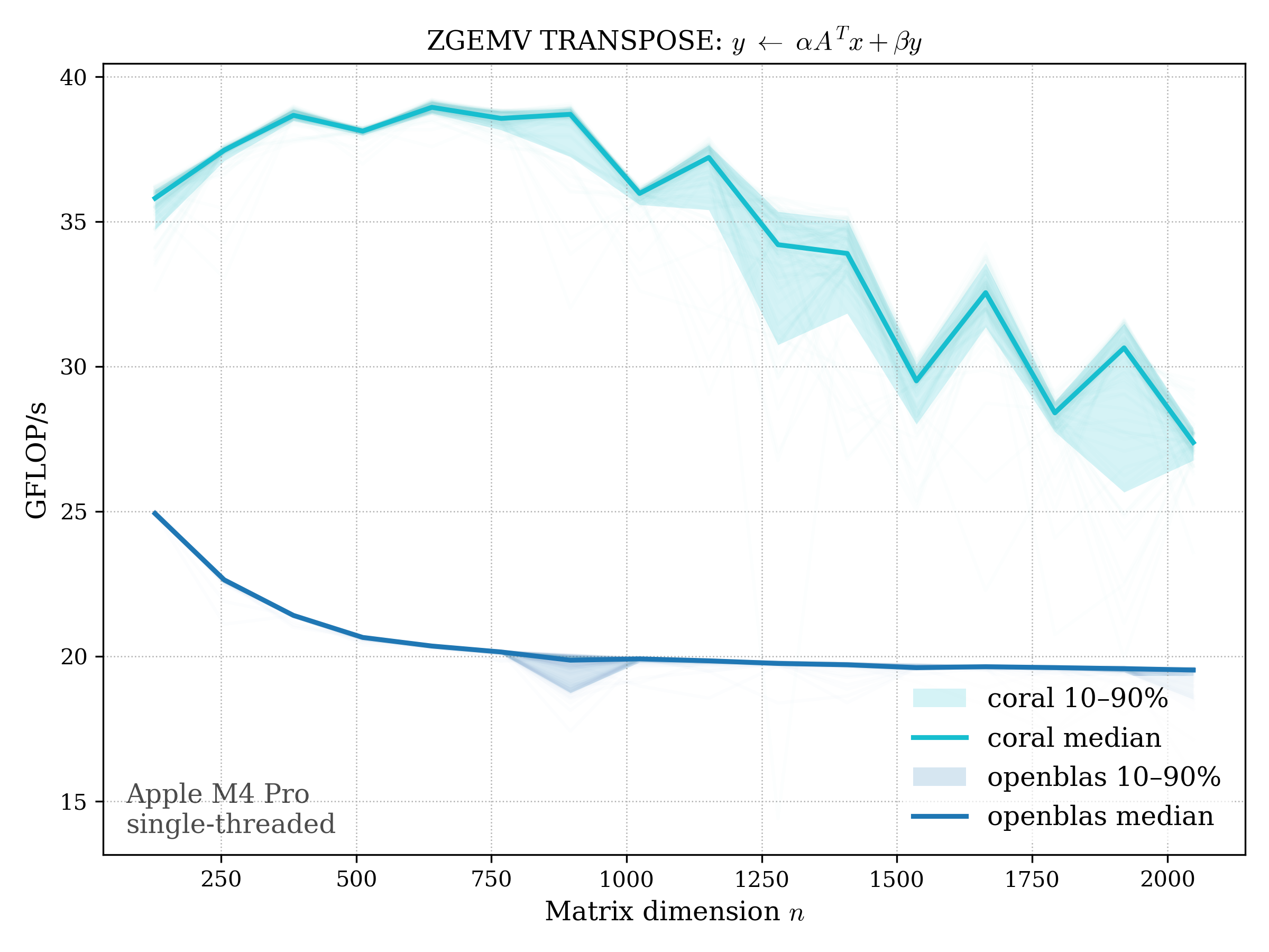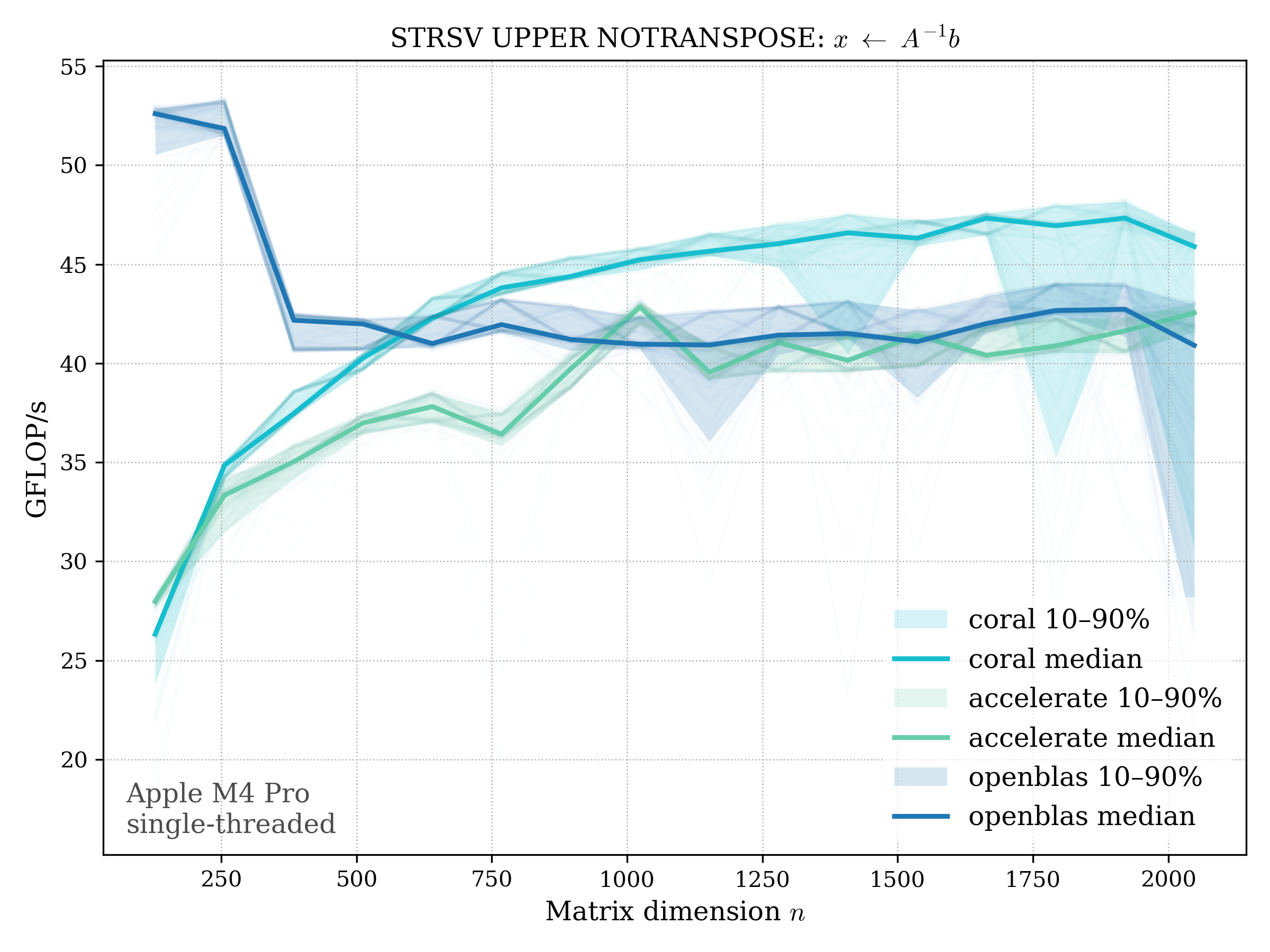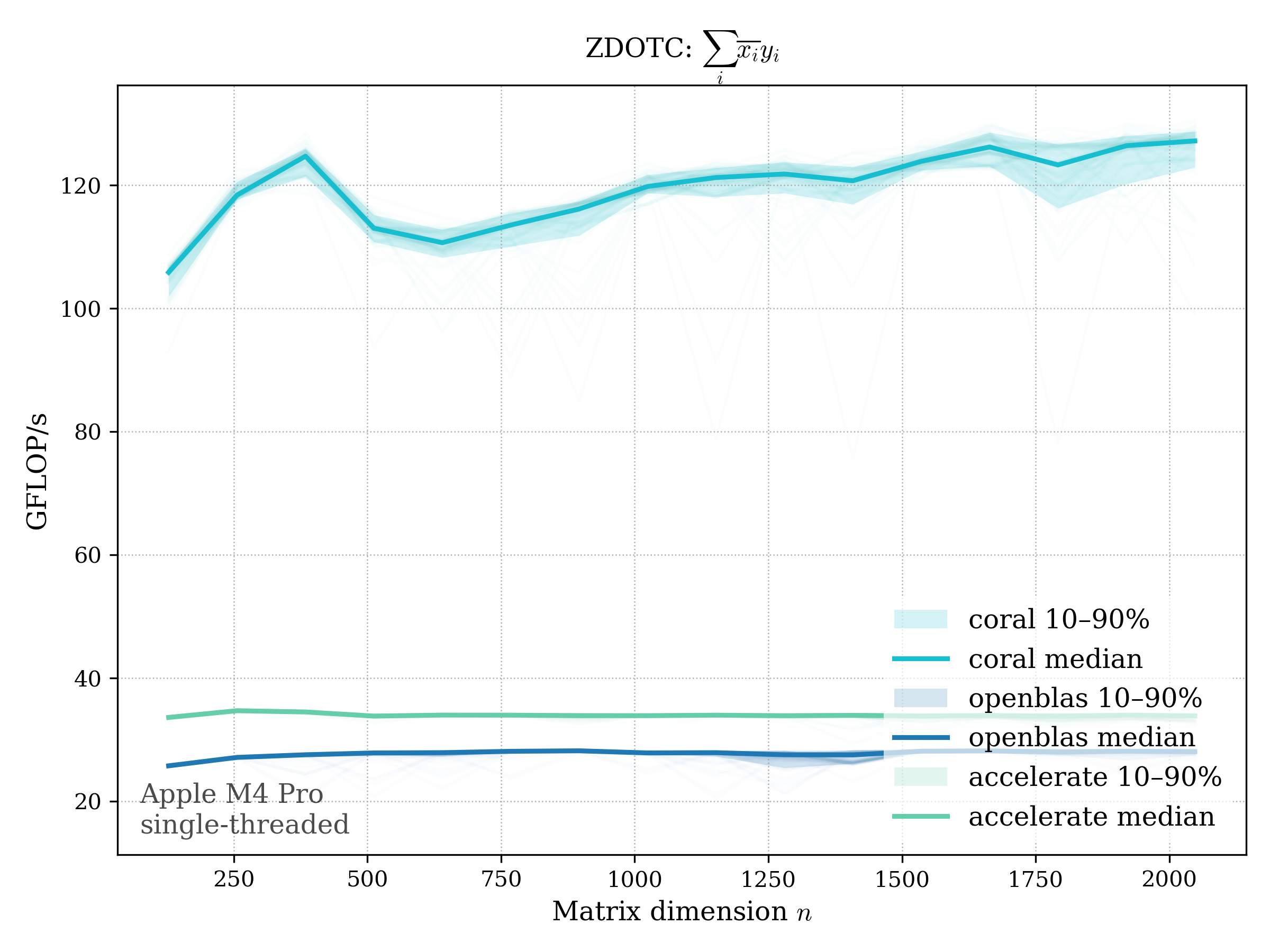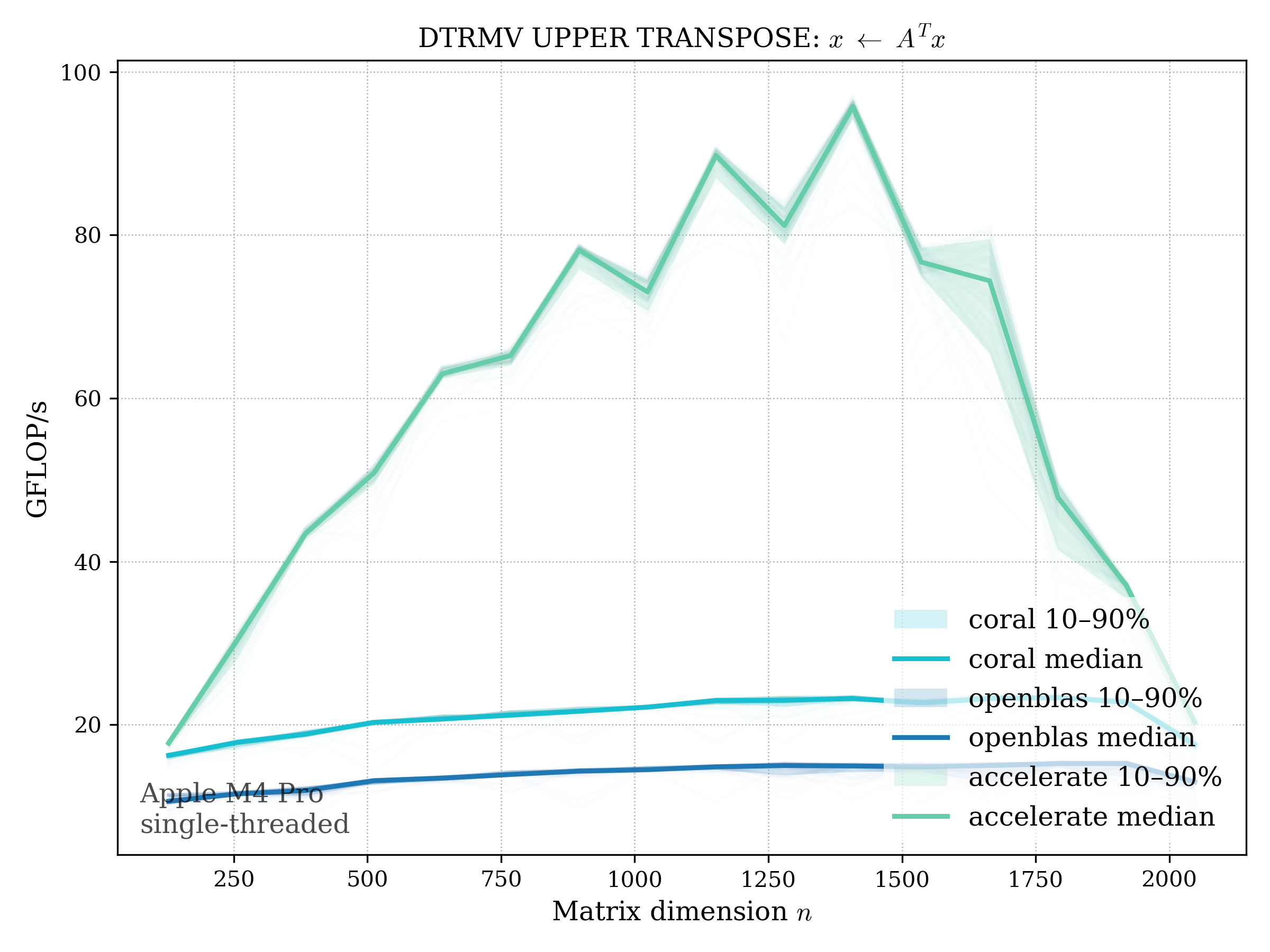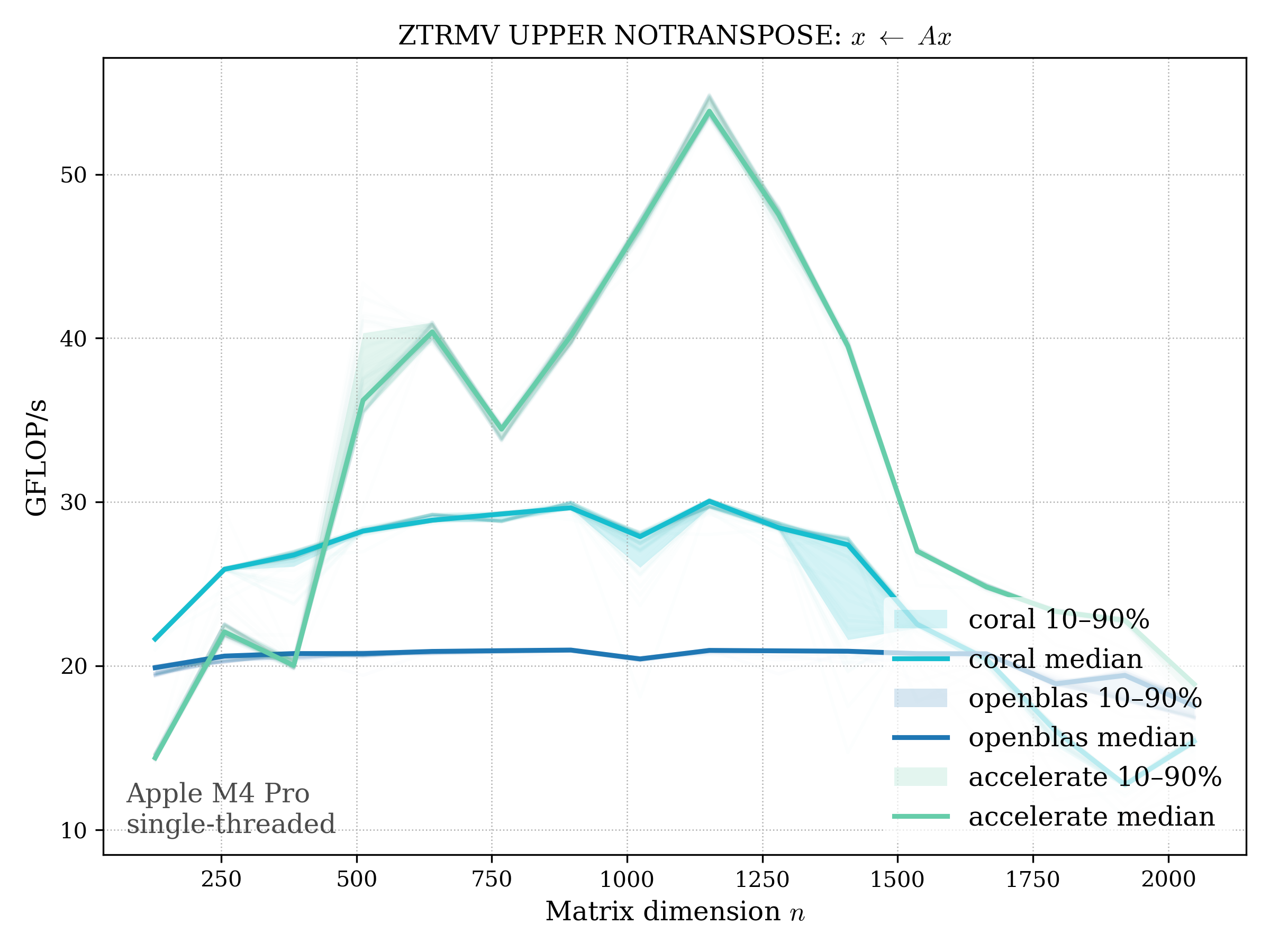 In all plots, CORAL is benchmarked against OpenBLAS. Some routines also include Apple Accelerate. When Accelerate is omitted, it’s because its AMX-backed kernels on this M4 MacBook Pro are much faster and mask any comparison with OpenBLAS.