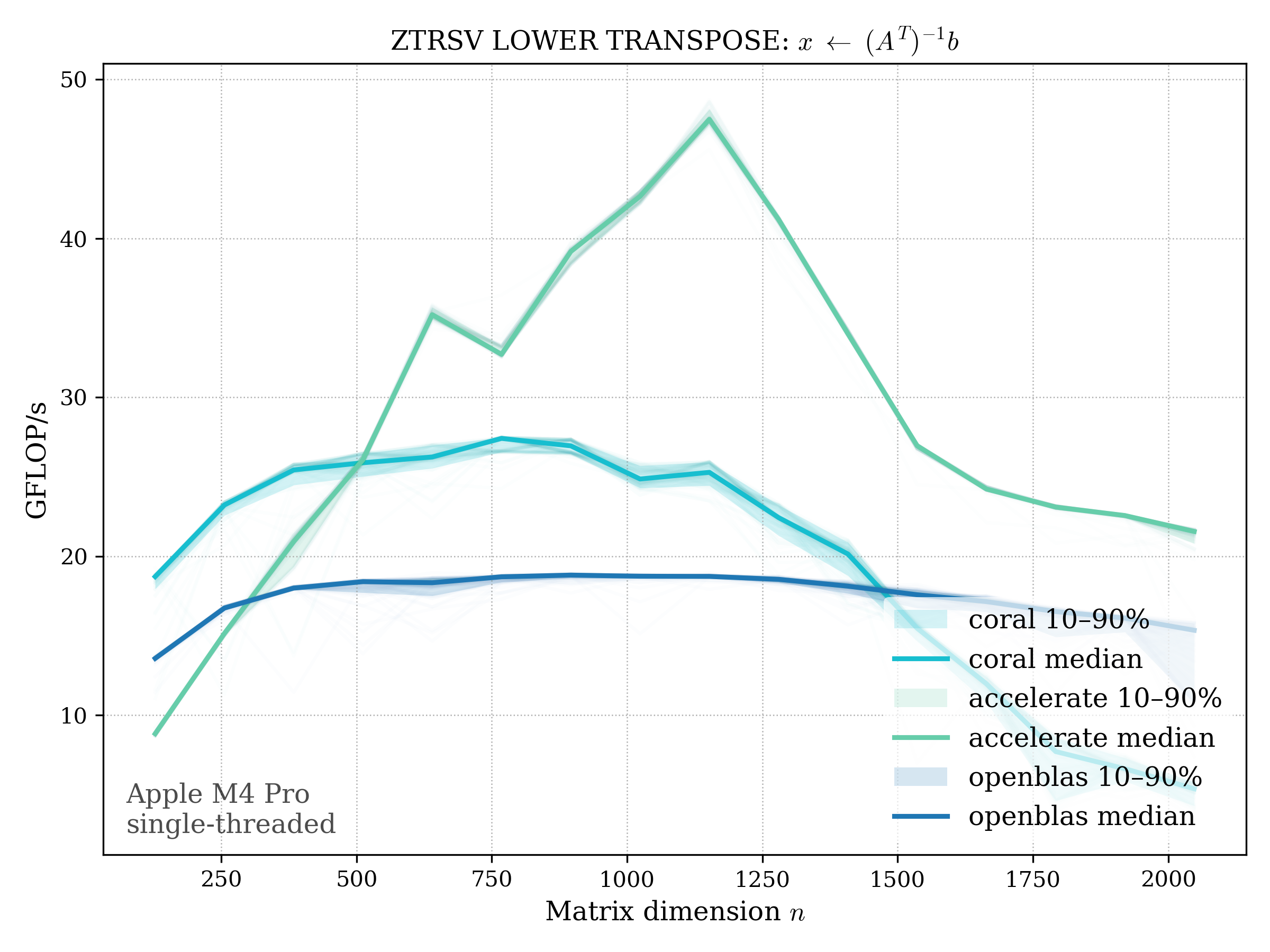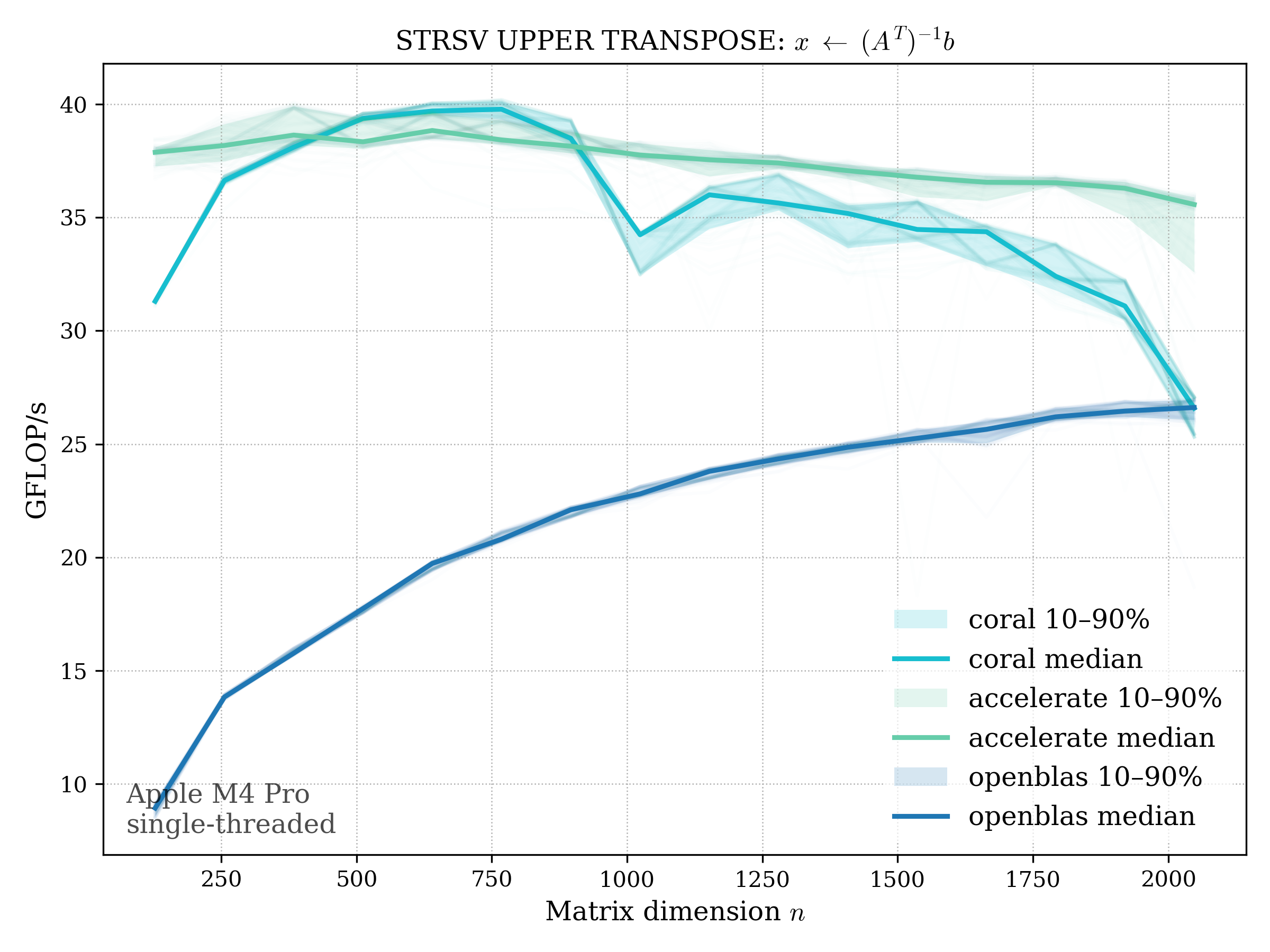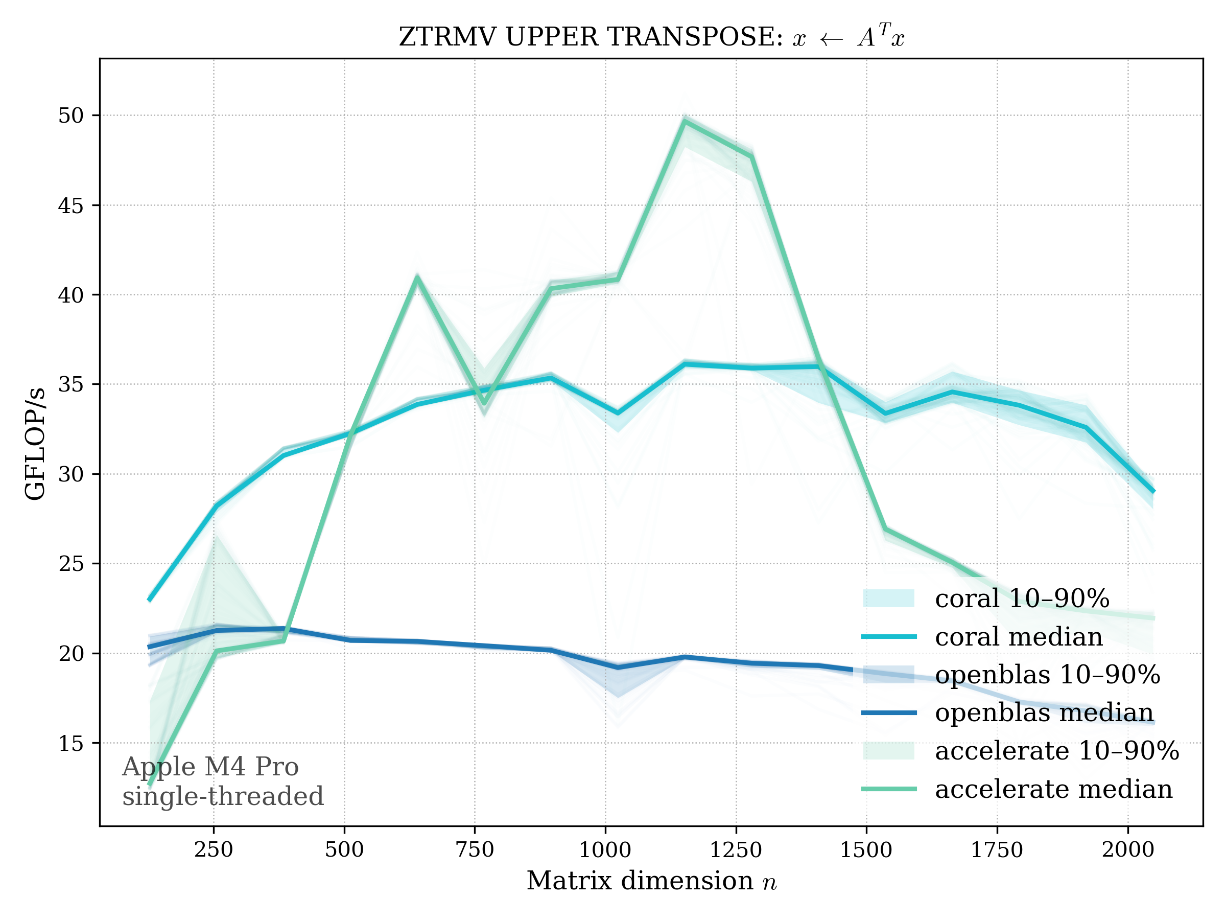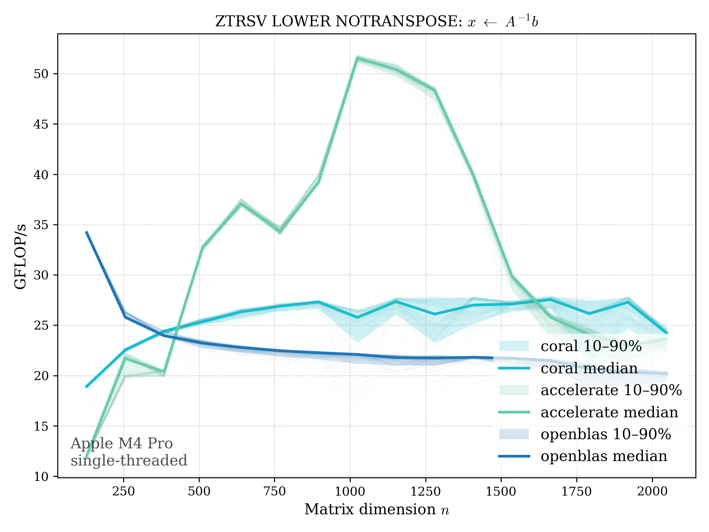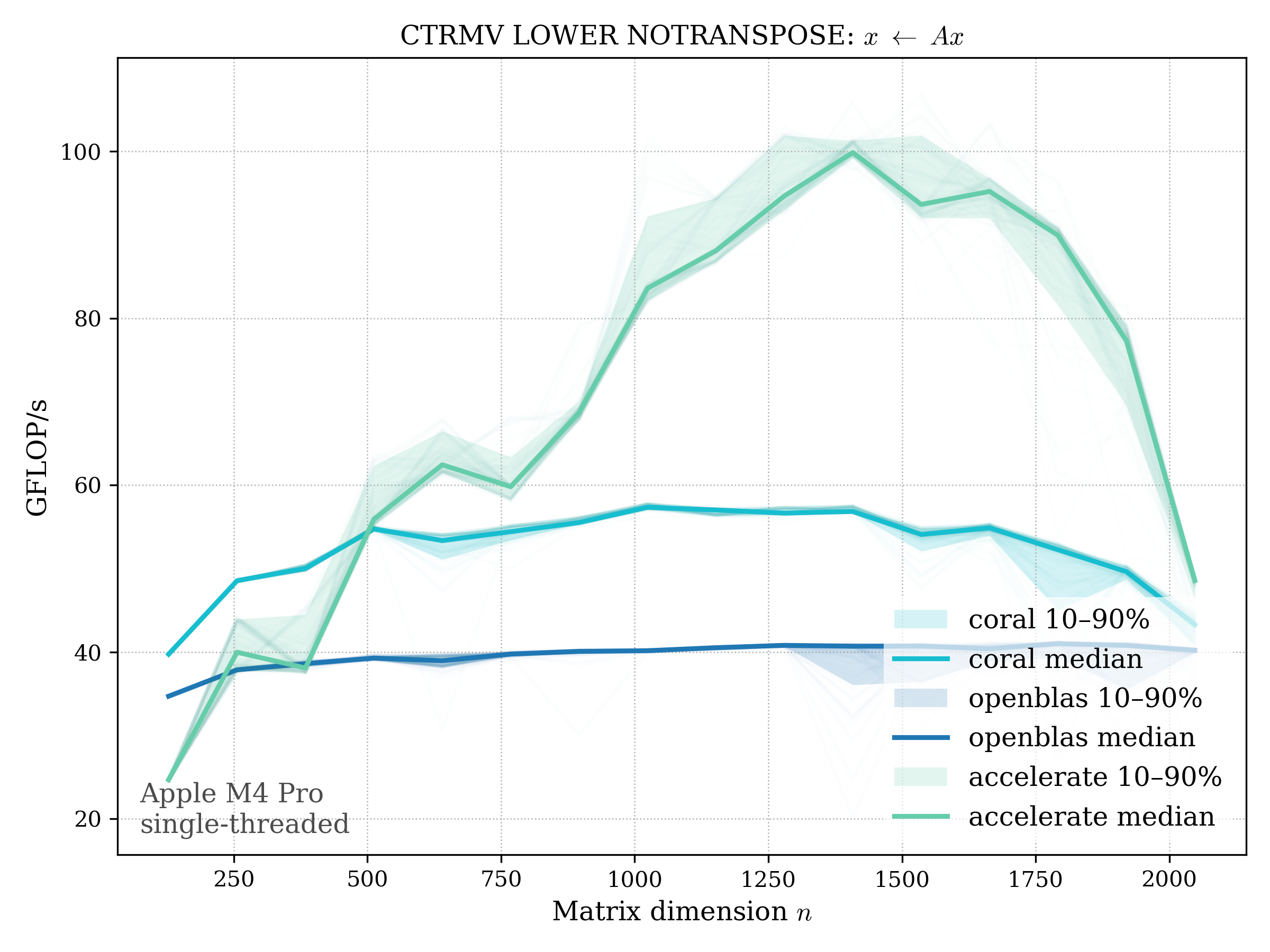 In all plots, CORAL is benchmarked against OpenBLAS. Some routines also include Apple Accelerate. When Accelerate is omitted, it’s because its AMX-backed kernels on this M4 MacBook Pro are much faster and mask any comparison with OpenBLAS.