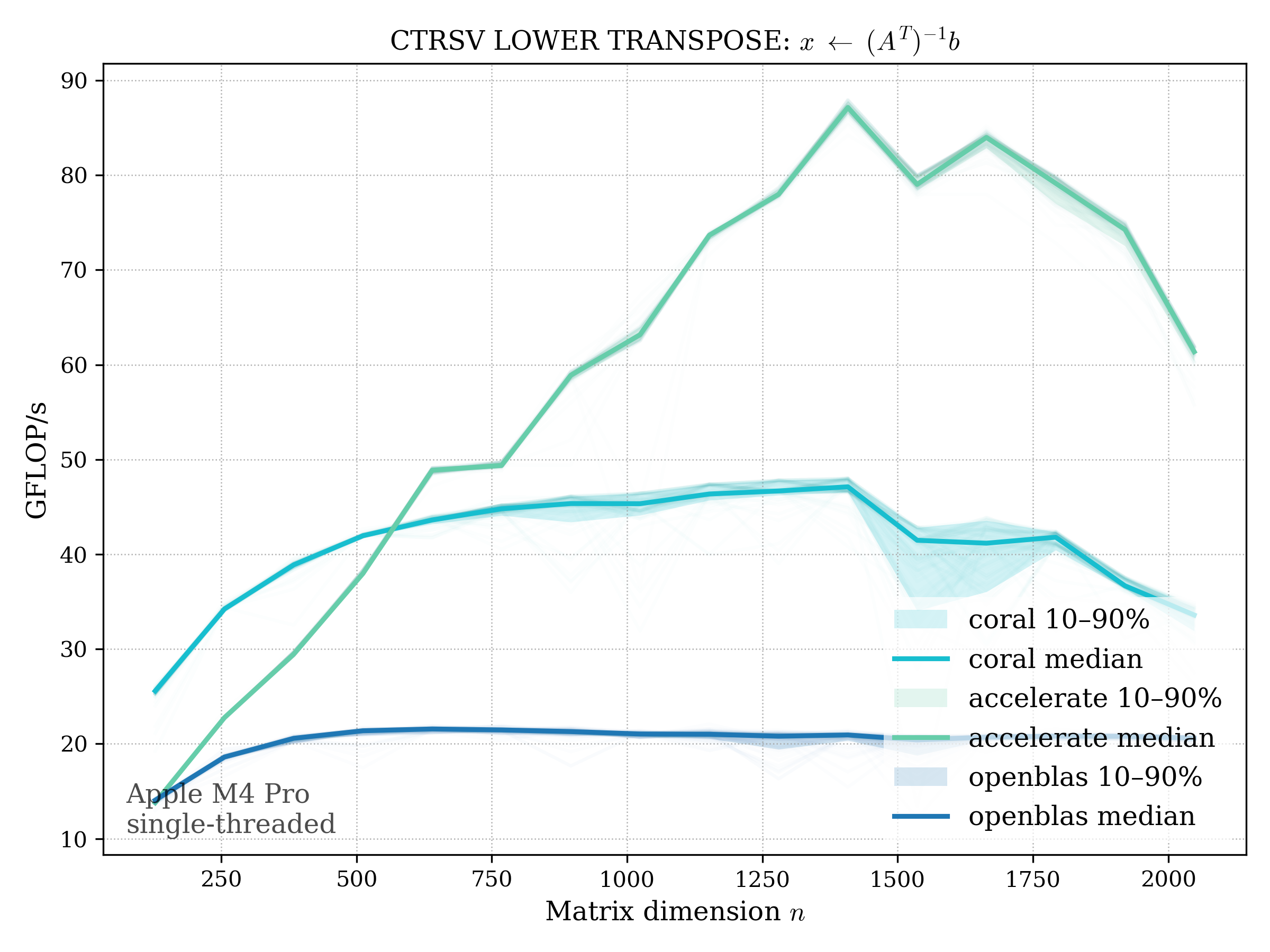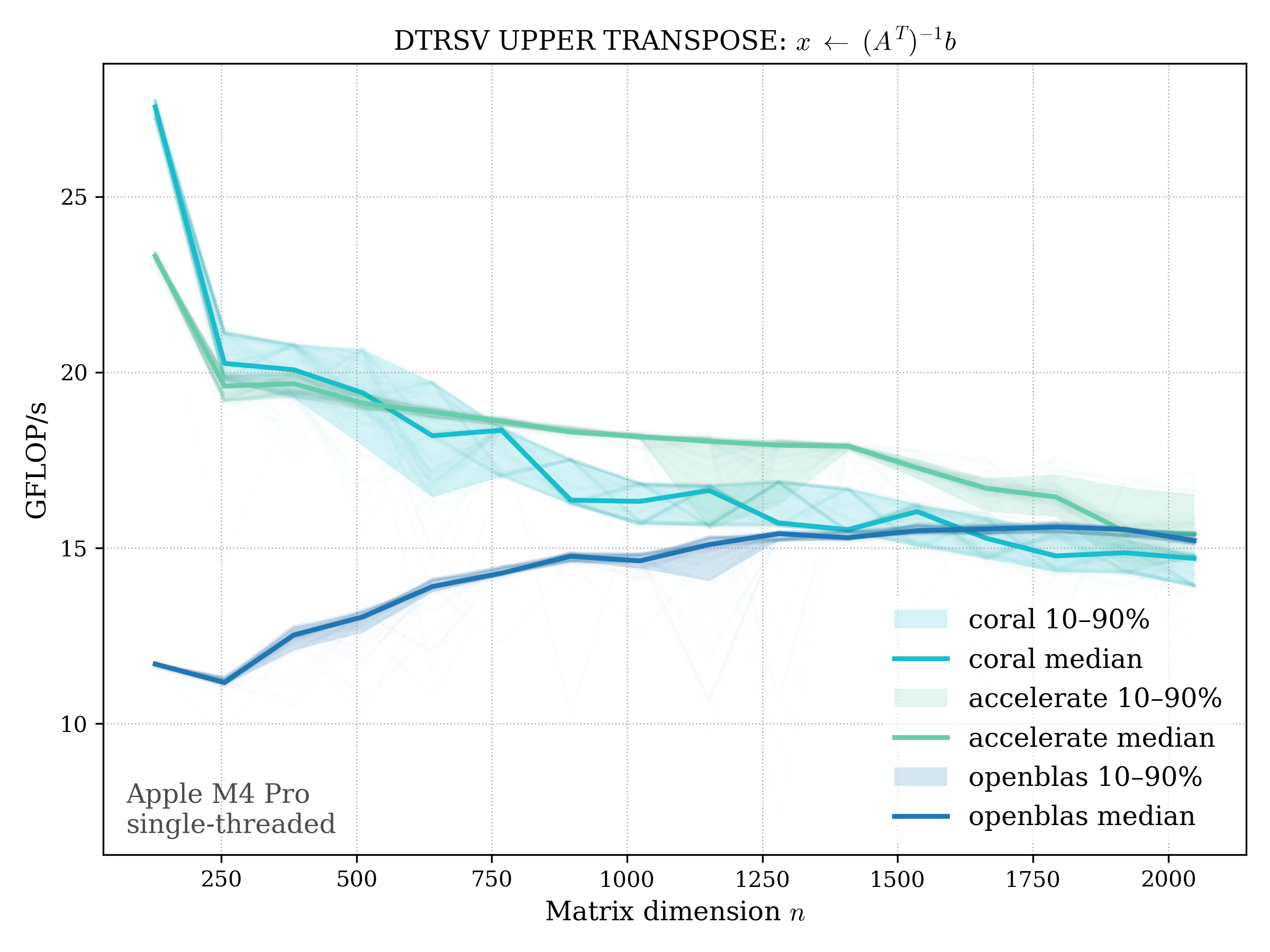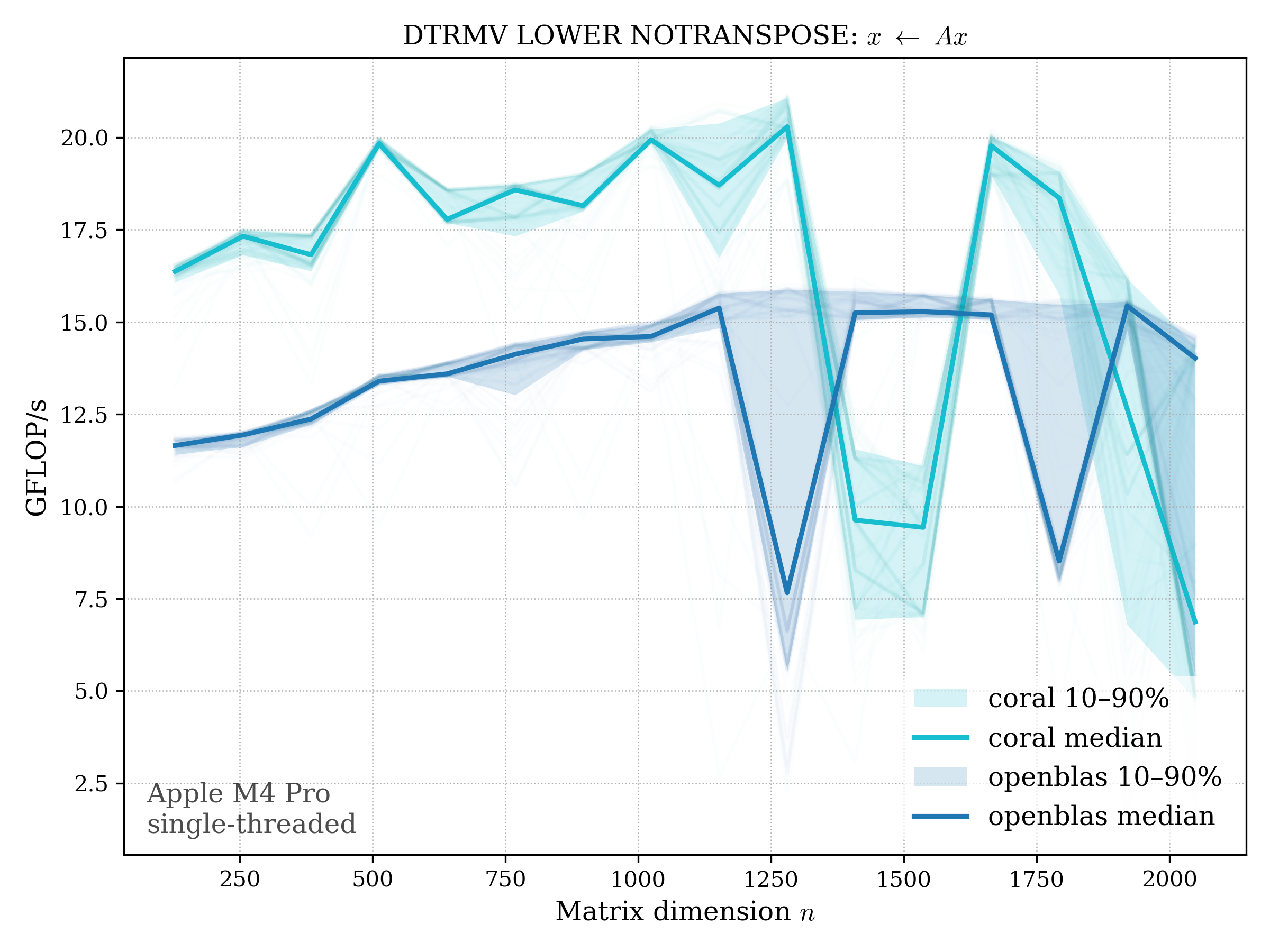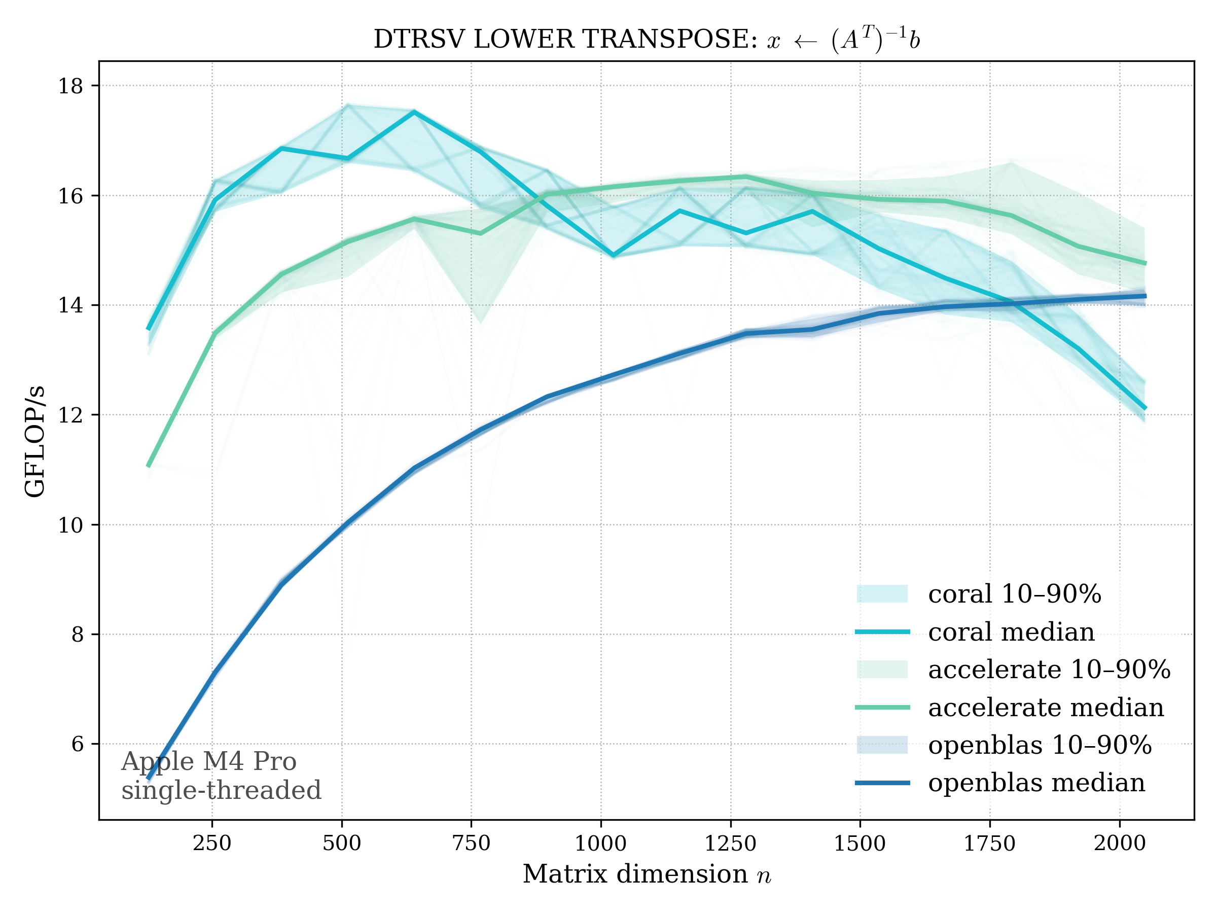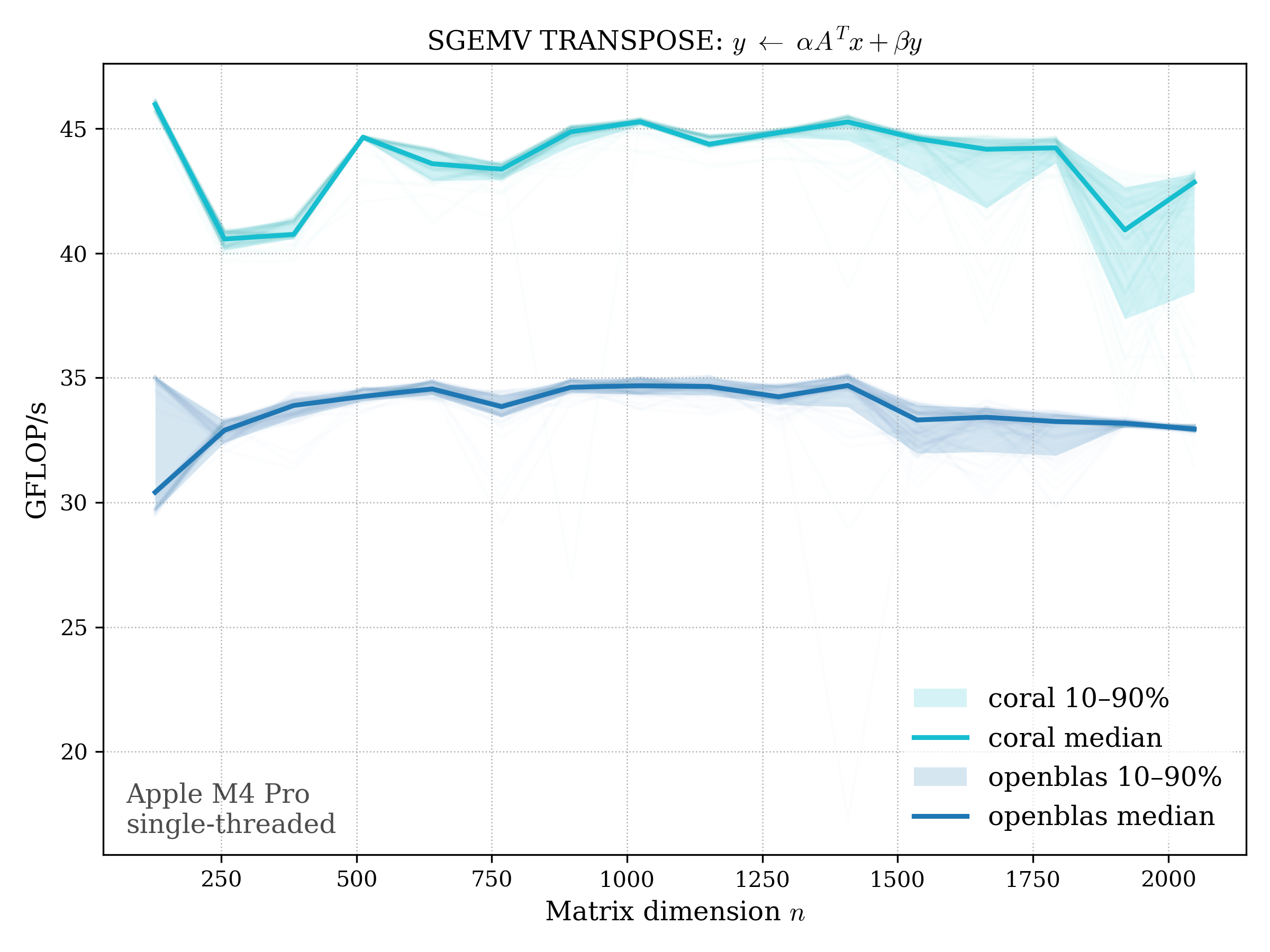 In all plots, CORAL is benchmarked against OpenBLAS. Some routines also include Apple Accelerate. When Accelerate is omitted, it’s because its AMX-backed kernels on this M4 MacBook Pro are much faster and mask any comparison with OpenBLAS.