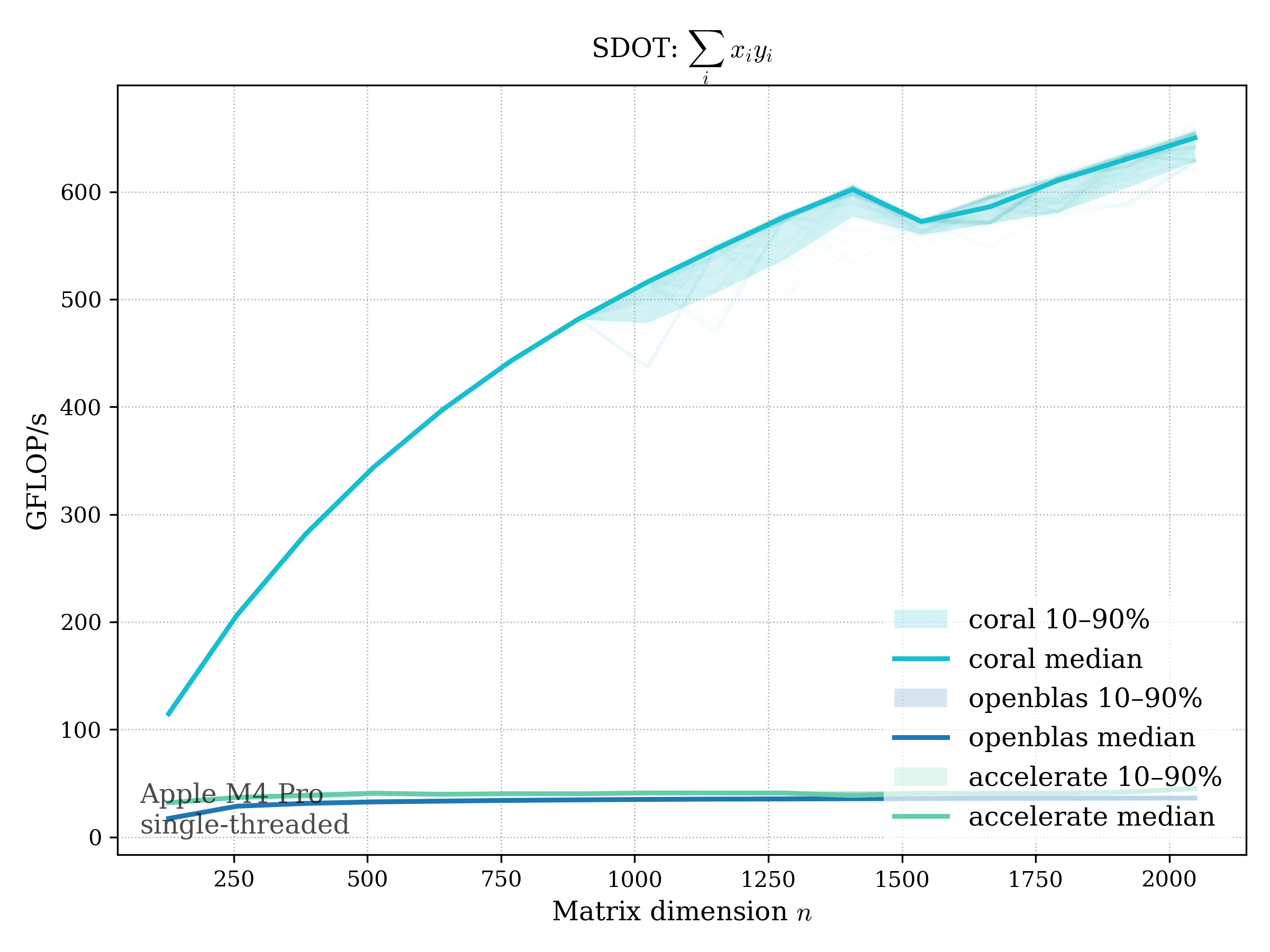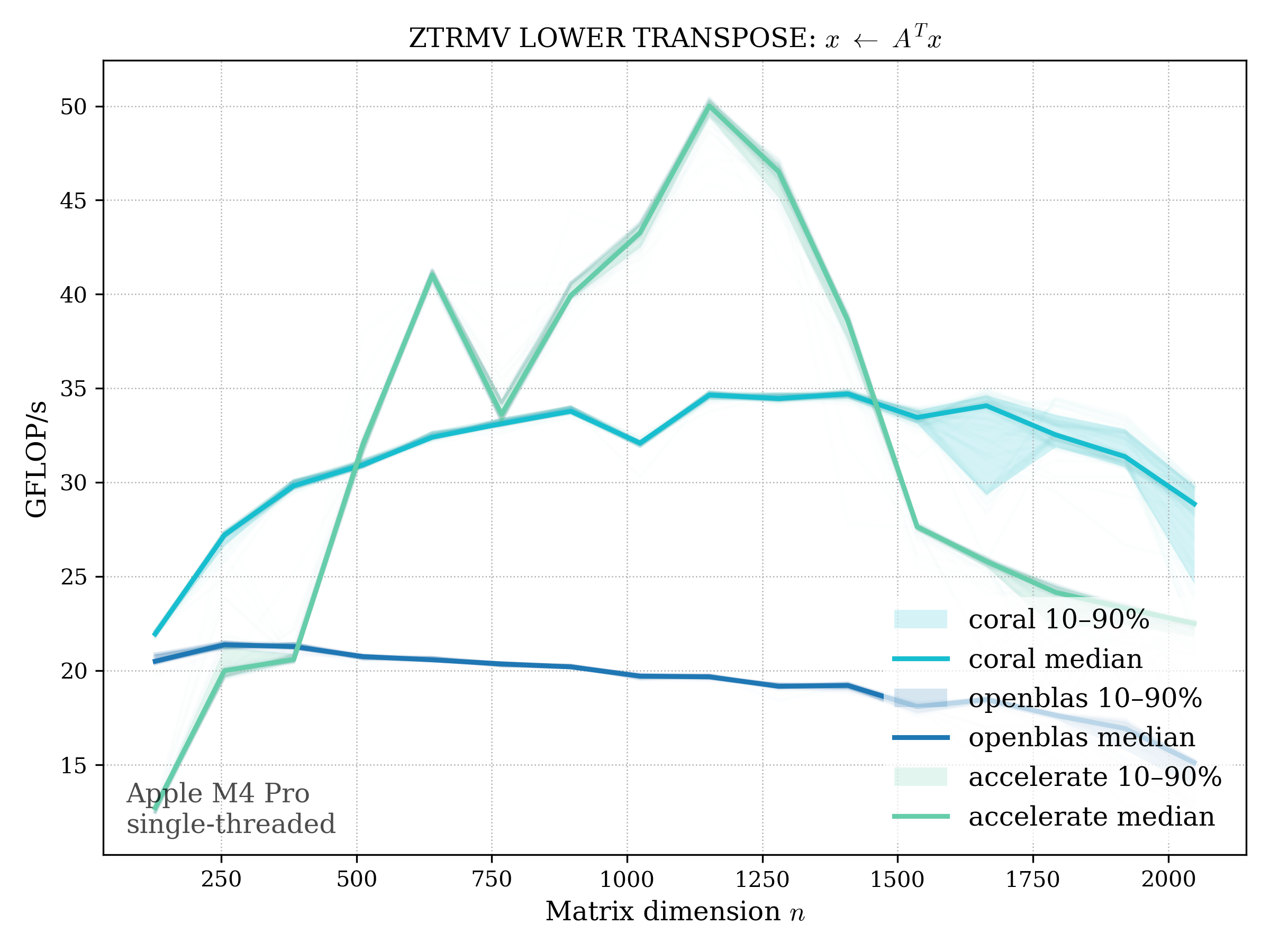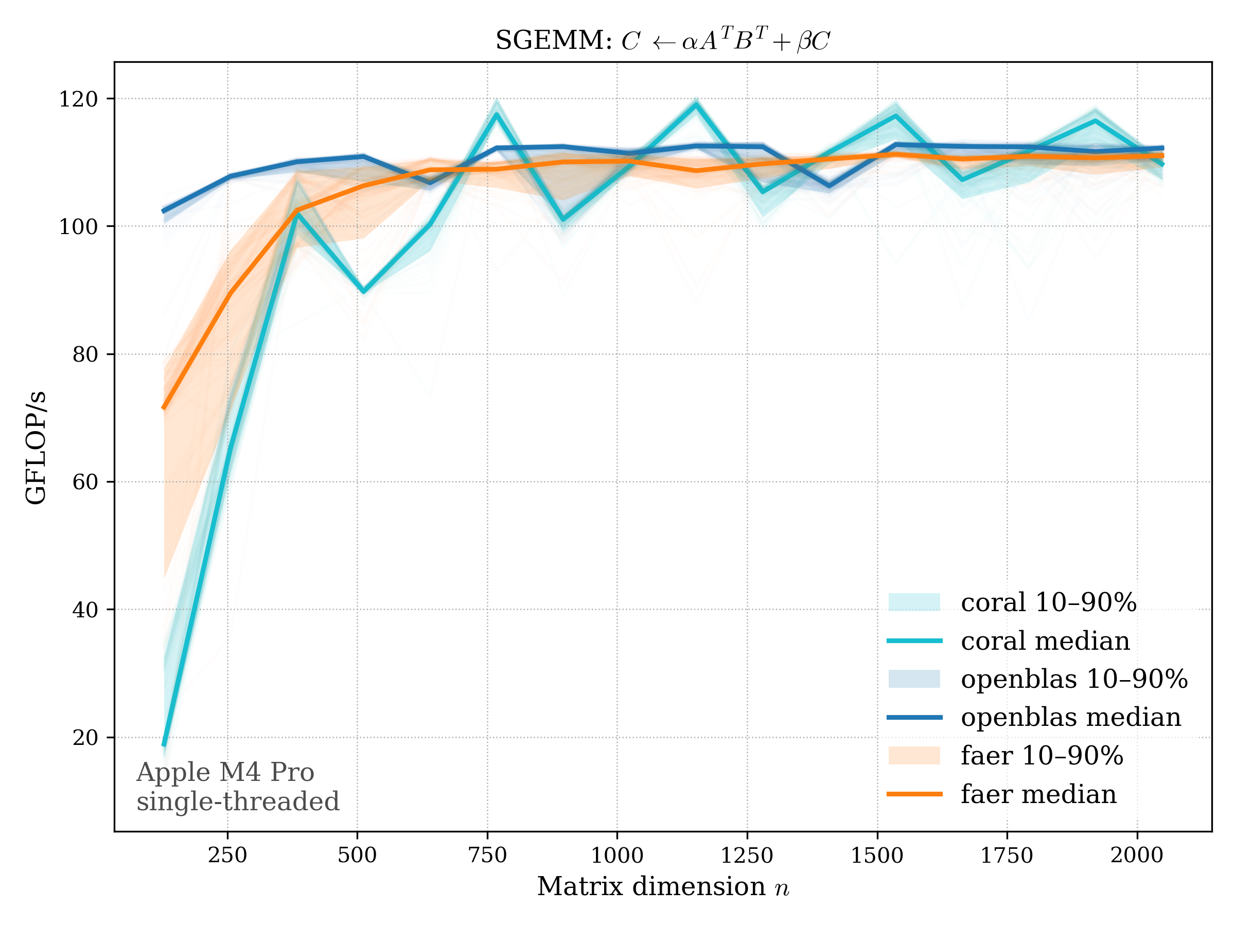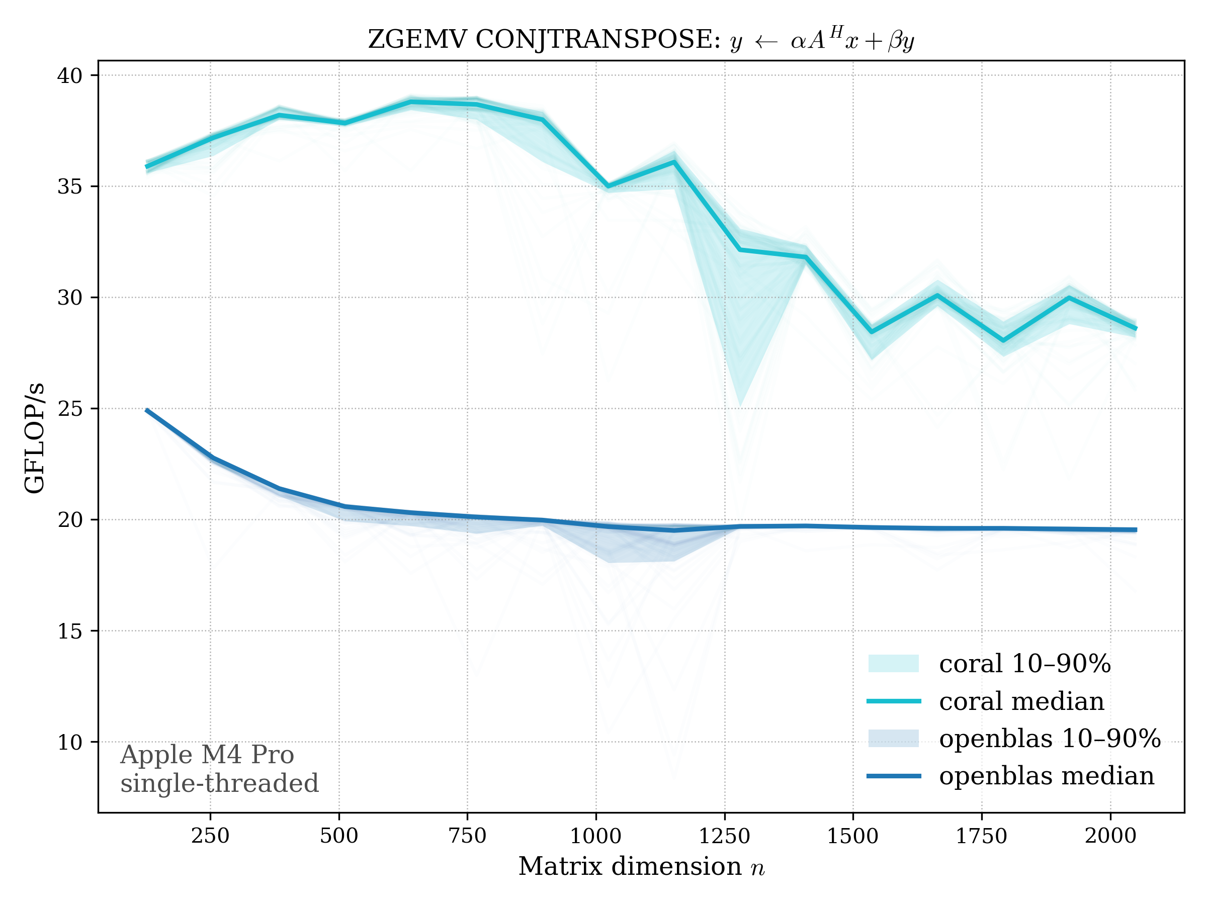 In all plots, CORAL is benchmarked against OpenBLAS. Some routines also include Apple Accelerate. When Accelerate is omitted, it’s because its AMX-backed kernels on this M4 MacBook Pro are much faster and mask any comparison with OpenBLAS.