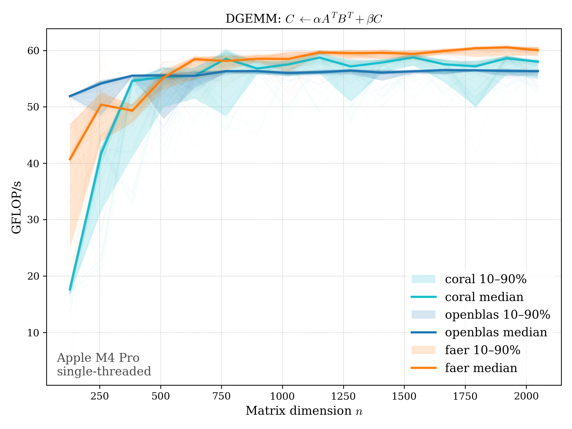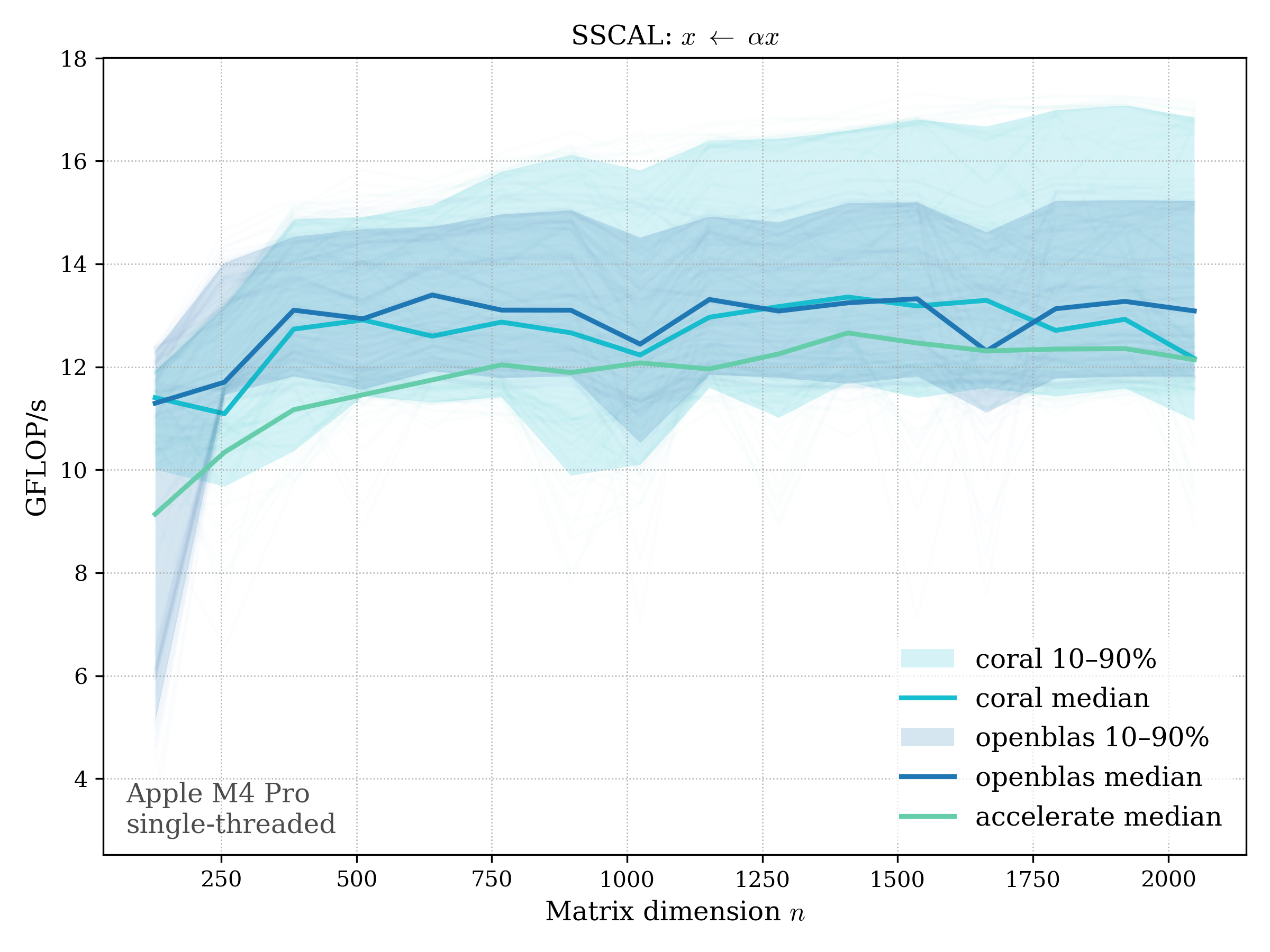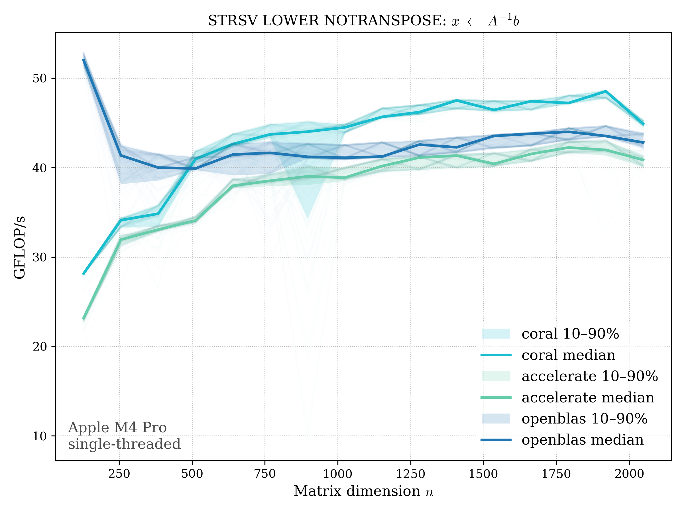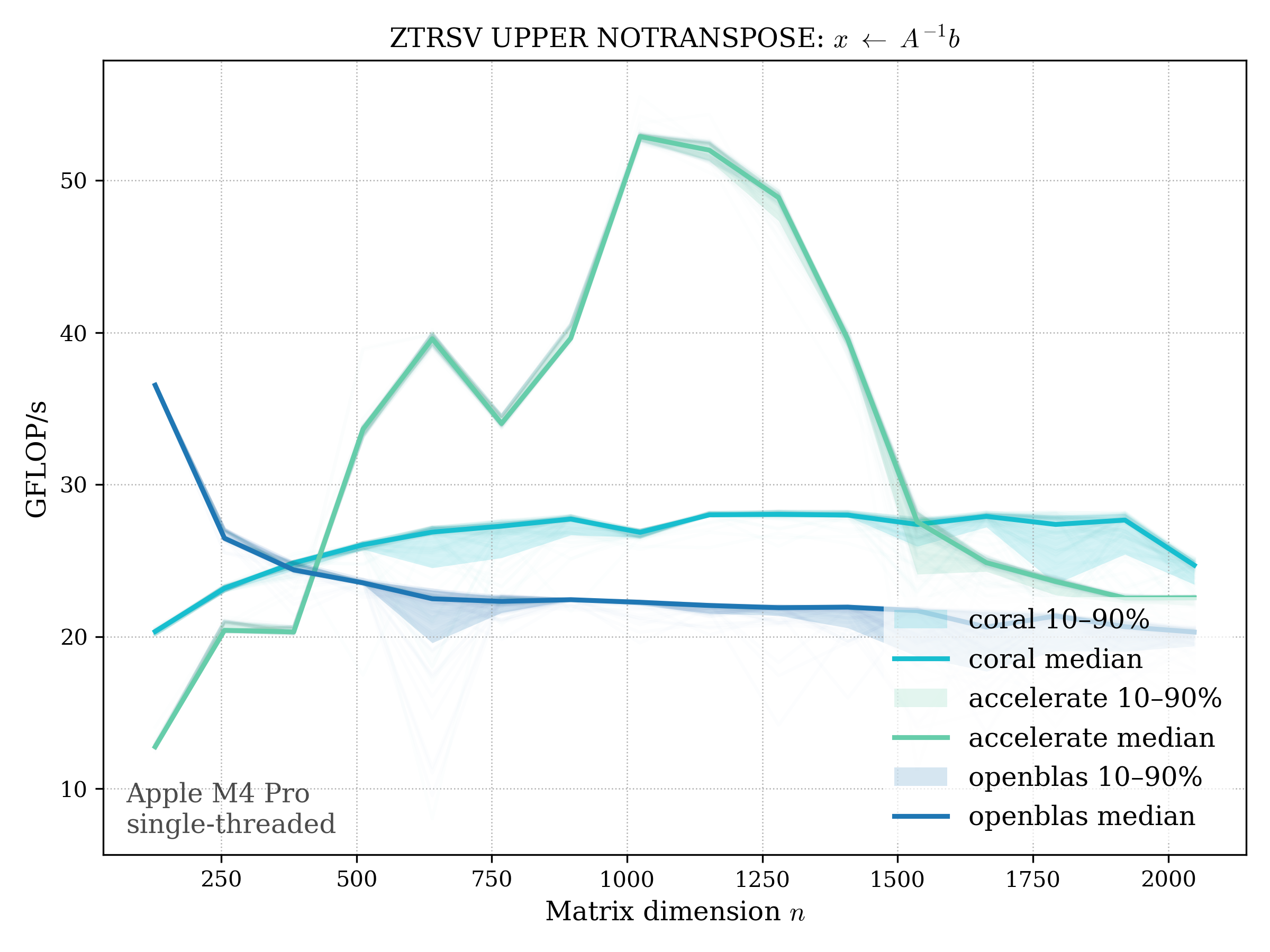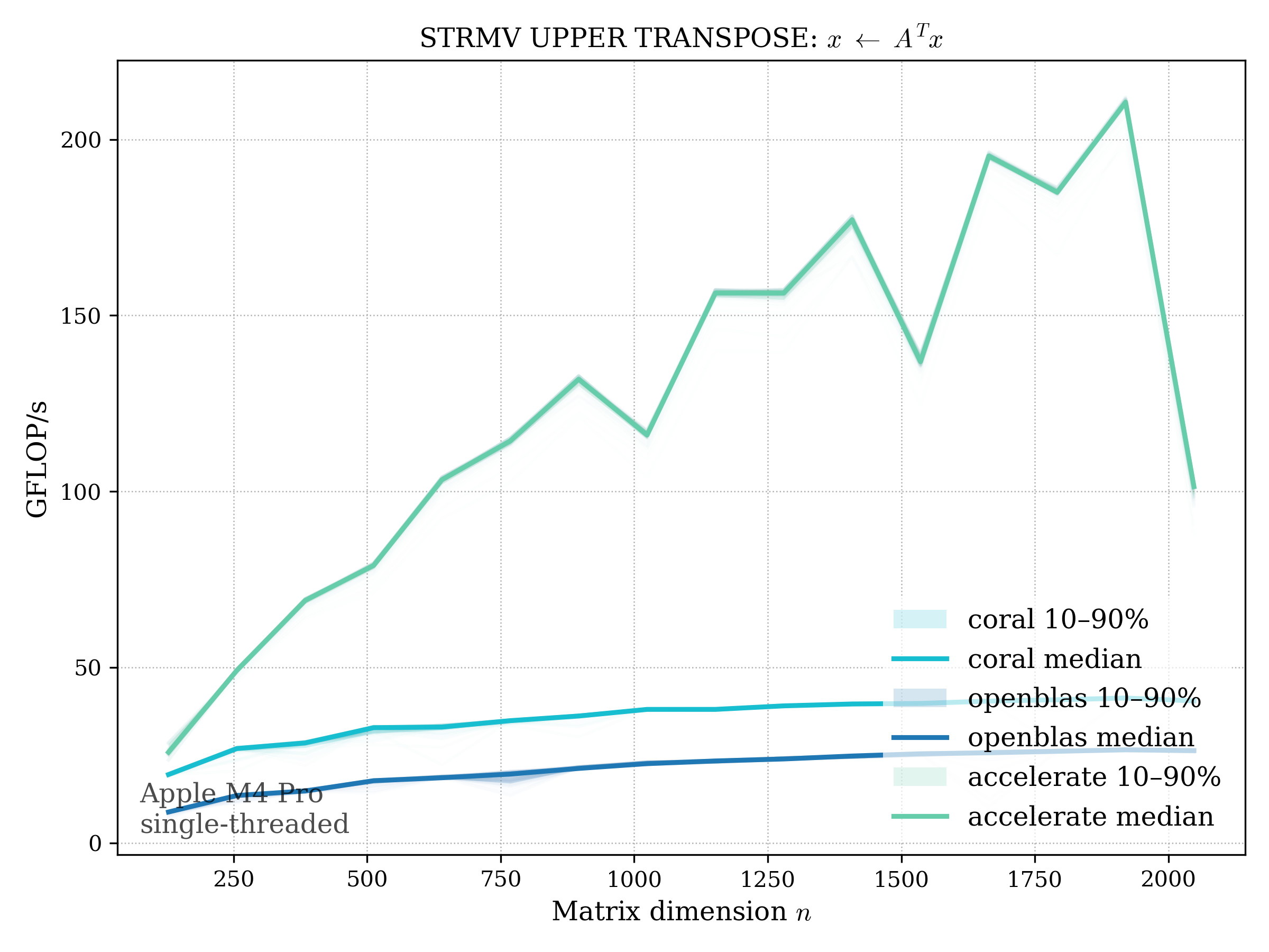 In all plots, CORAL is benchmarked against OpenBLAS. Some routines also include Apple Accelerate. When Accelerate is omitted, it’s because its AMX-backed kernels on this M4 MacBook Pro are much faster and mask any comparison with OpenBLAS.