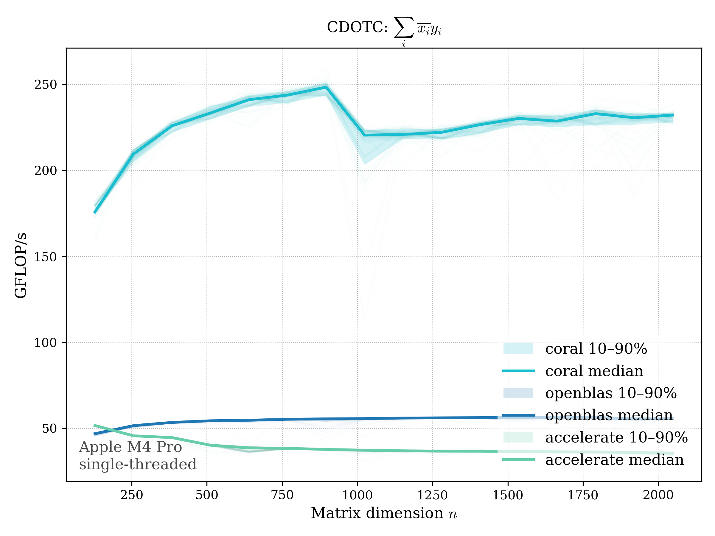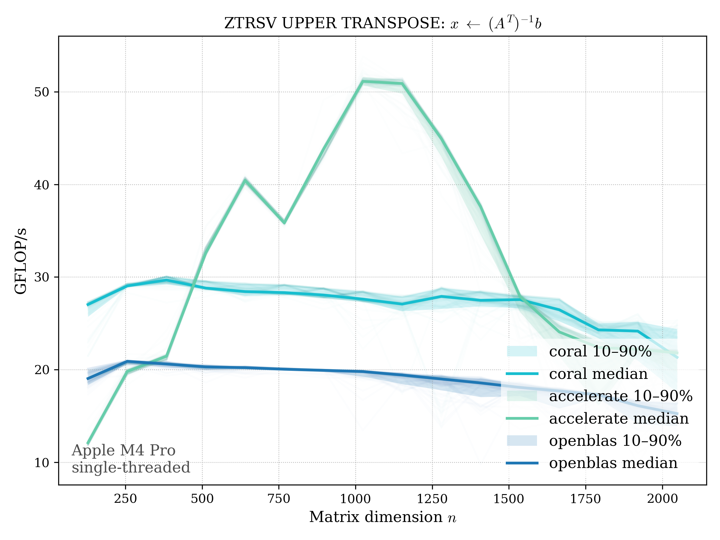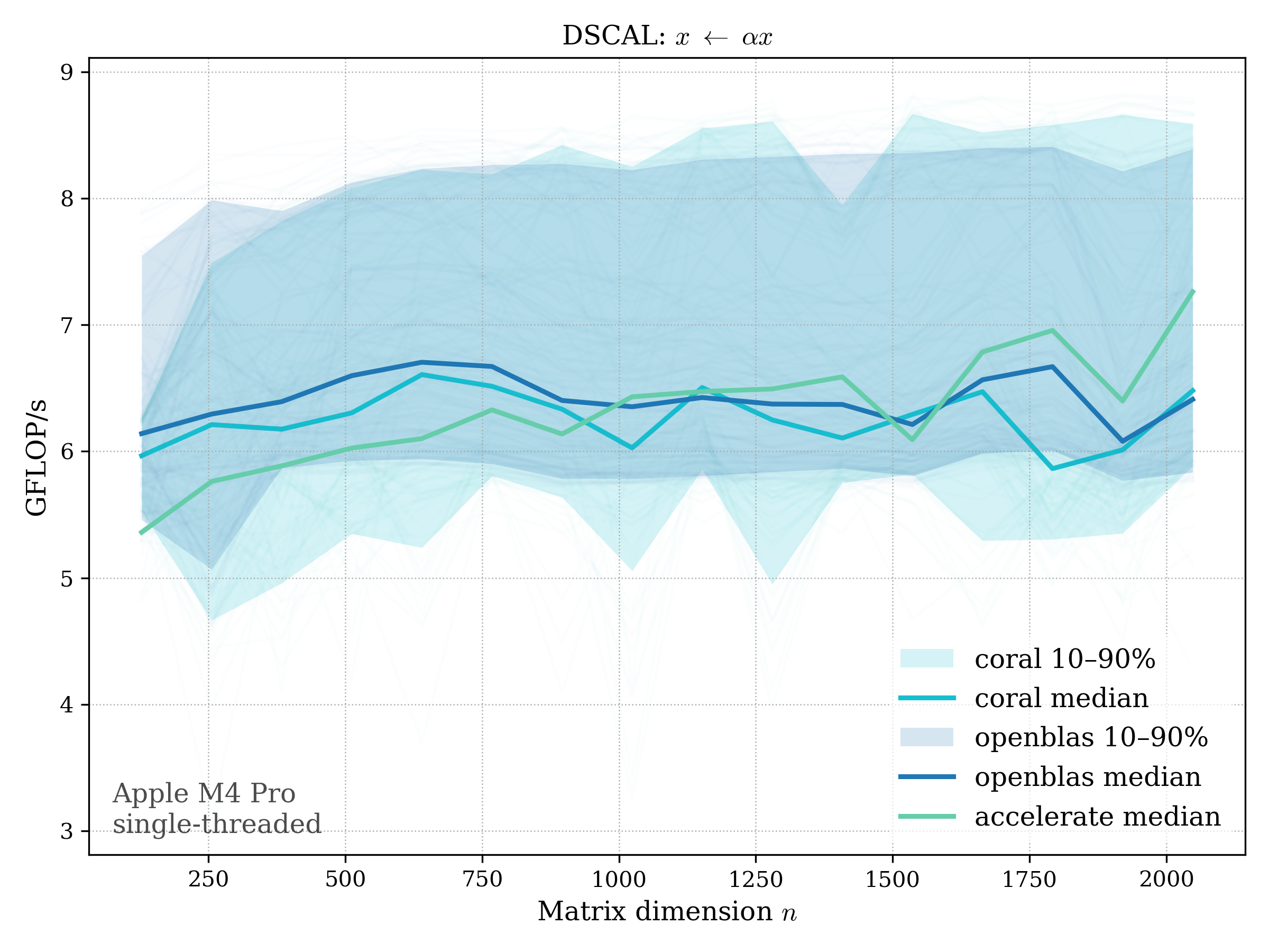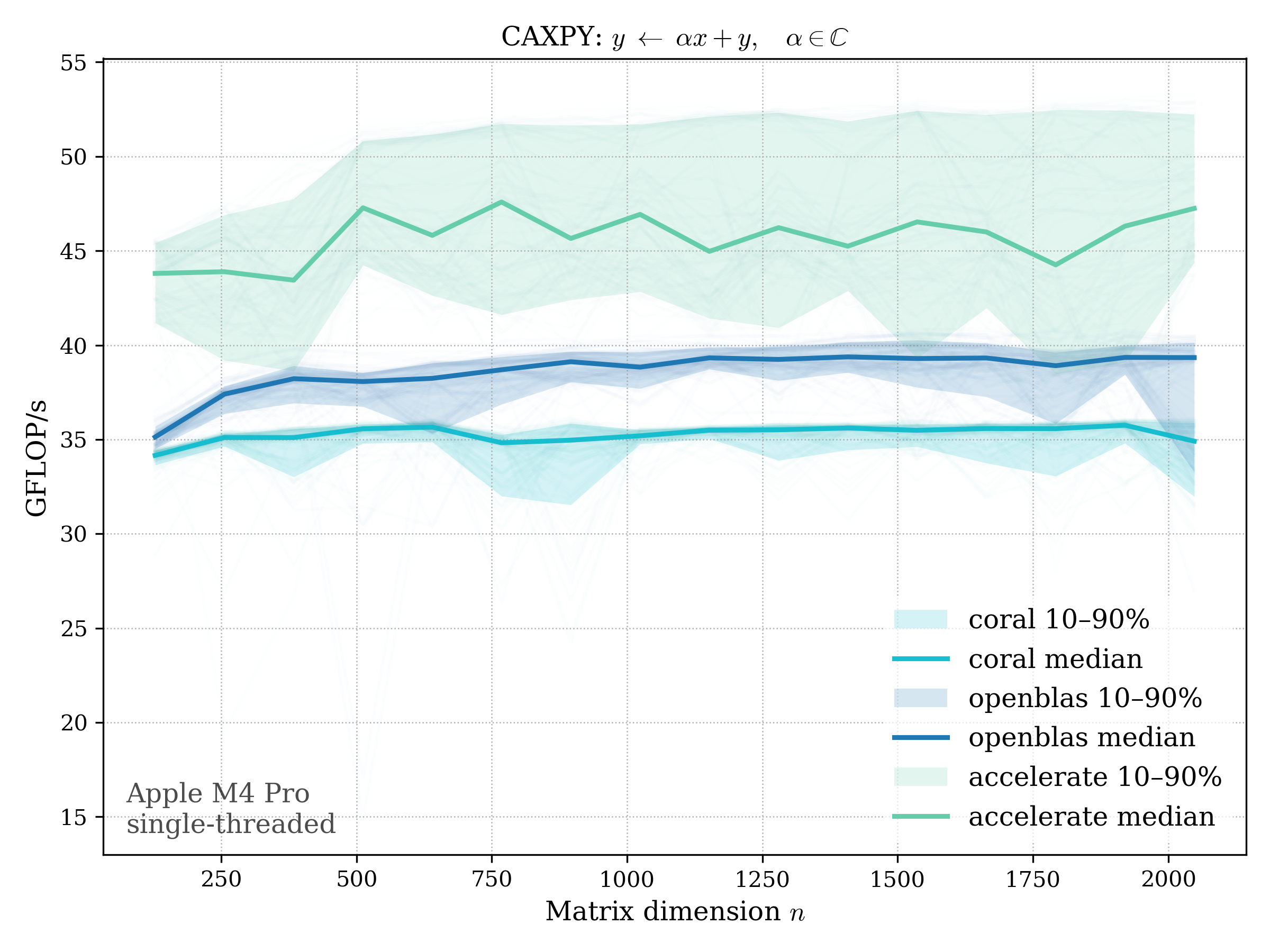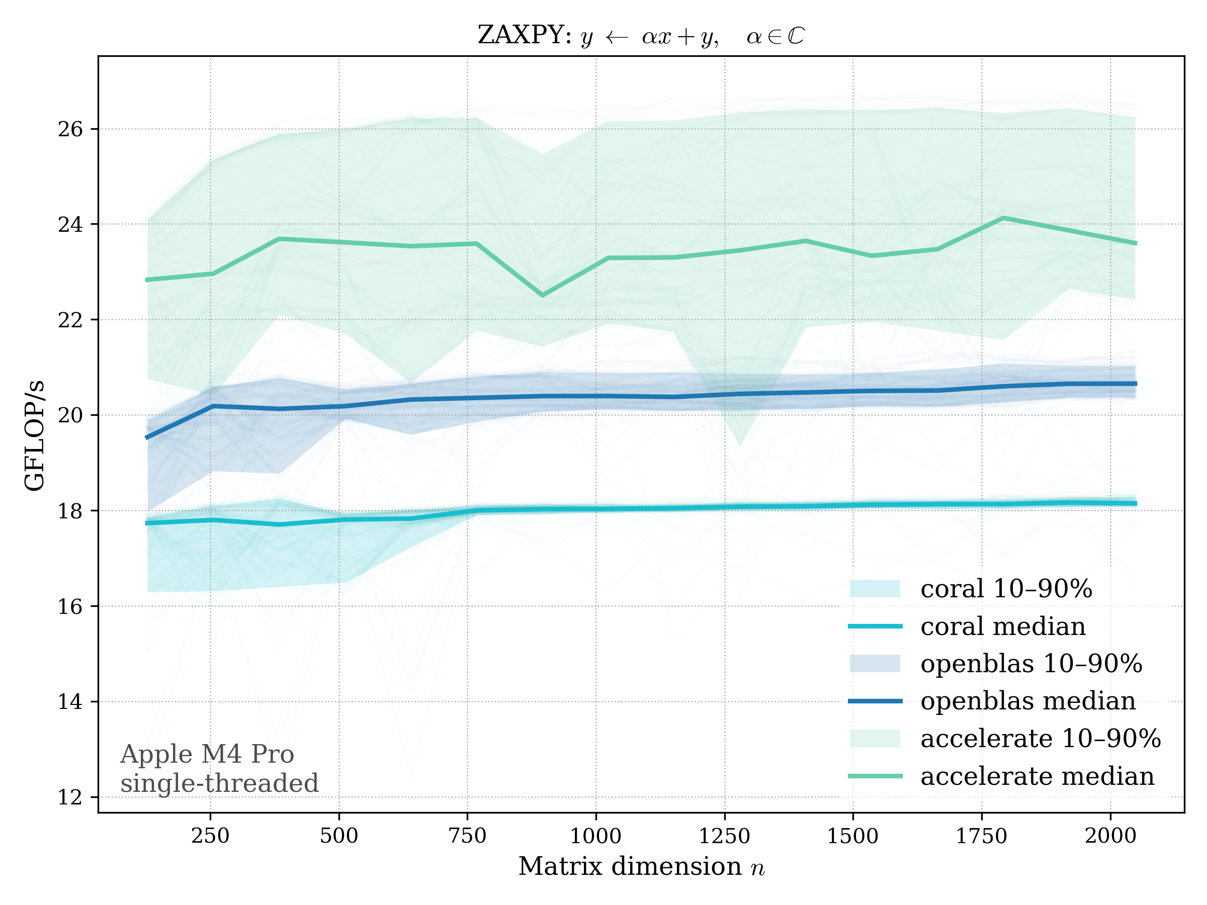 In all plots, CORAL is benchmarked against OpenBLAS. Some routines also include Apple Accelerate. When Accelerate is omitted, it’s because its AMX-backed kernels on this M4 MacBook Pro are much faster and mask any comparison with OpenBLAS.
